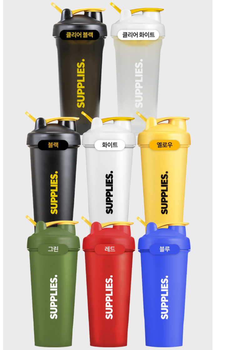 서플라이스 프로틴 쉐이커 보틀은 블랙, 화이트, 옐로우, 그린, 레드, 블루, 클리어 블랙 이렇게 7가지 색상로 골라 볼 수 있습니다.