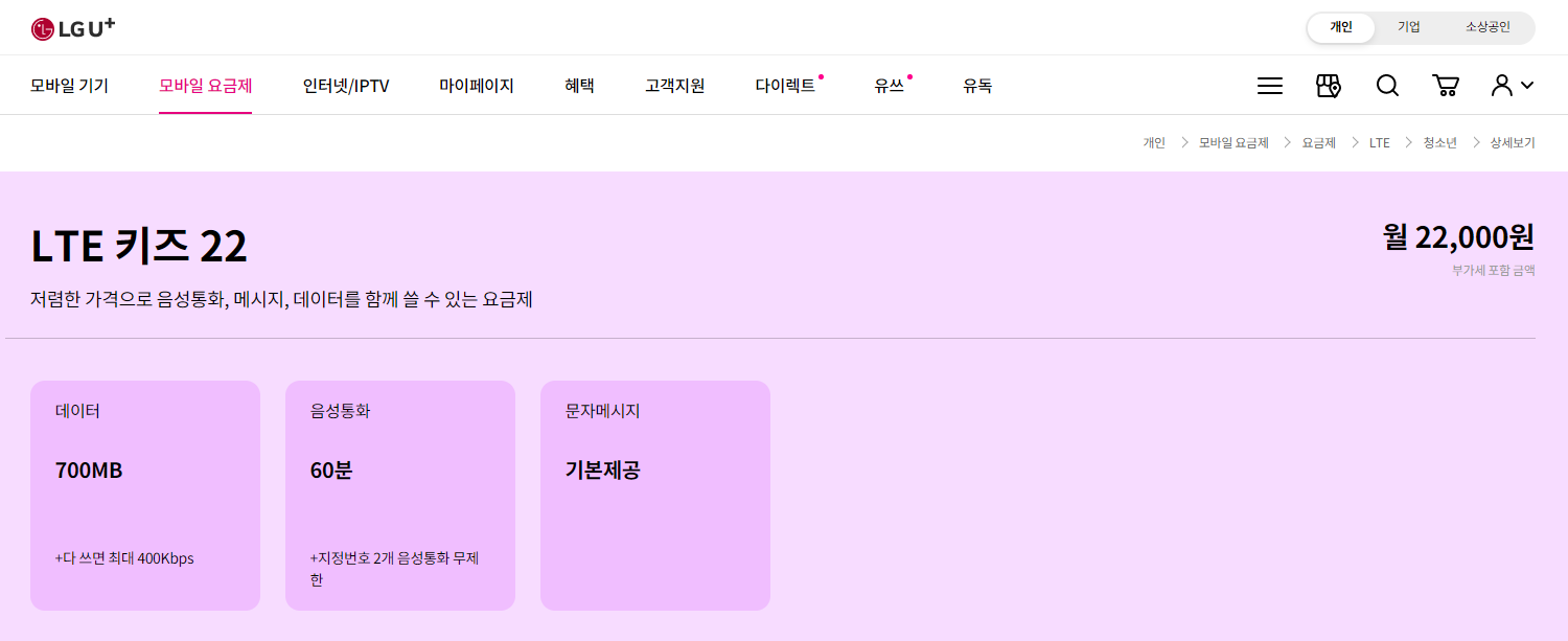 키즈폰 요금제로 유플러스 LTE22 요금제를 신청했습니다.
