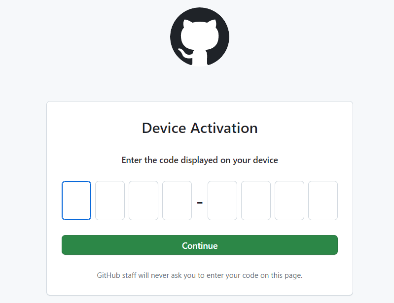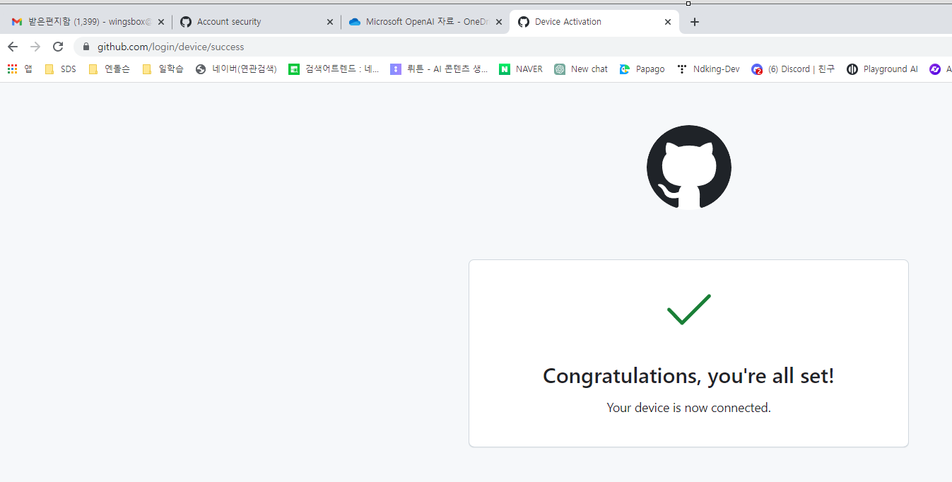 그리고 위의 GitHub Device Activation에 넣어 주면 인증이 됩니다.