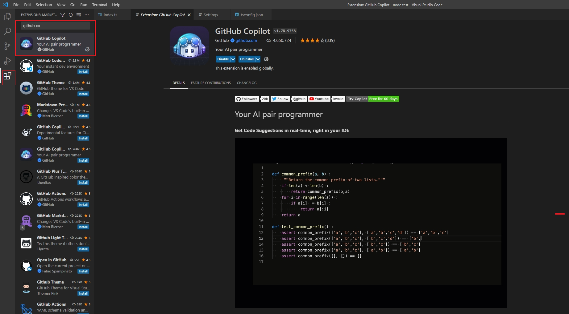 Visual Studio Code 에서 GitHub Copilot의 확장팩을 설치합니다.