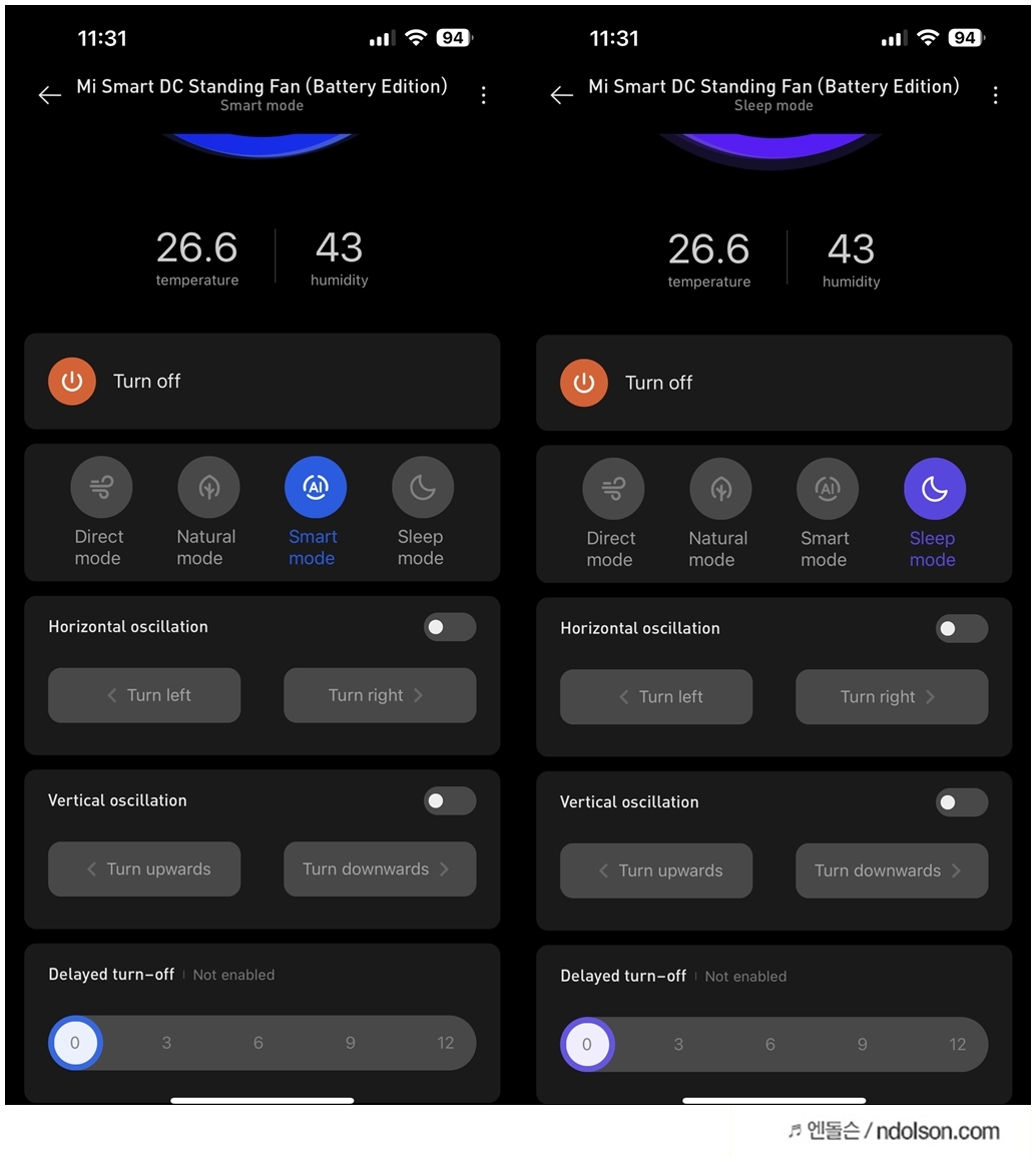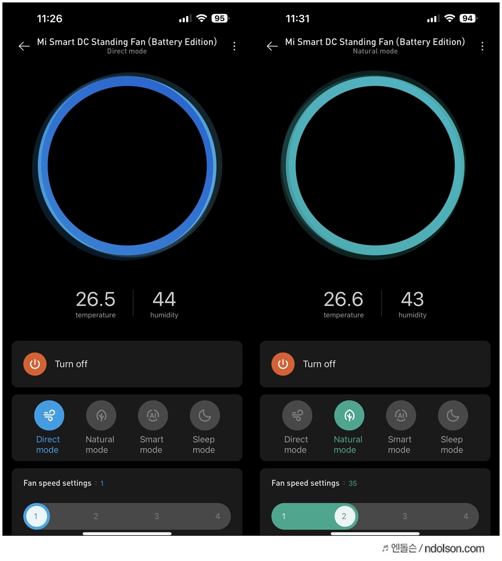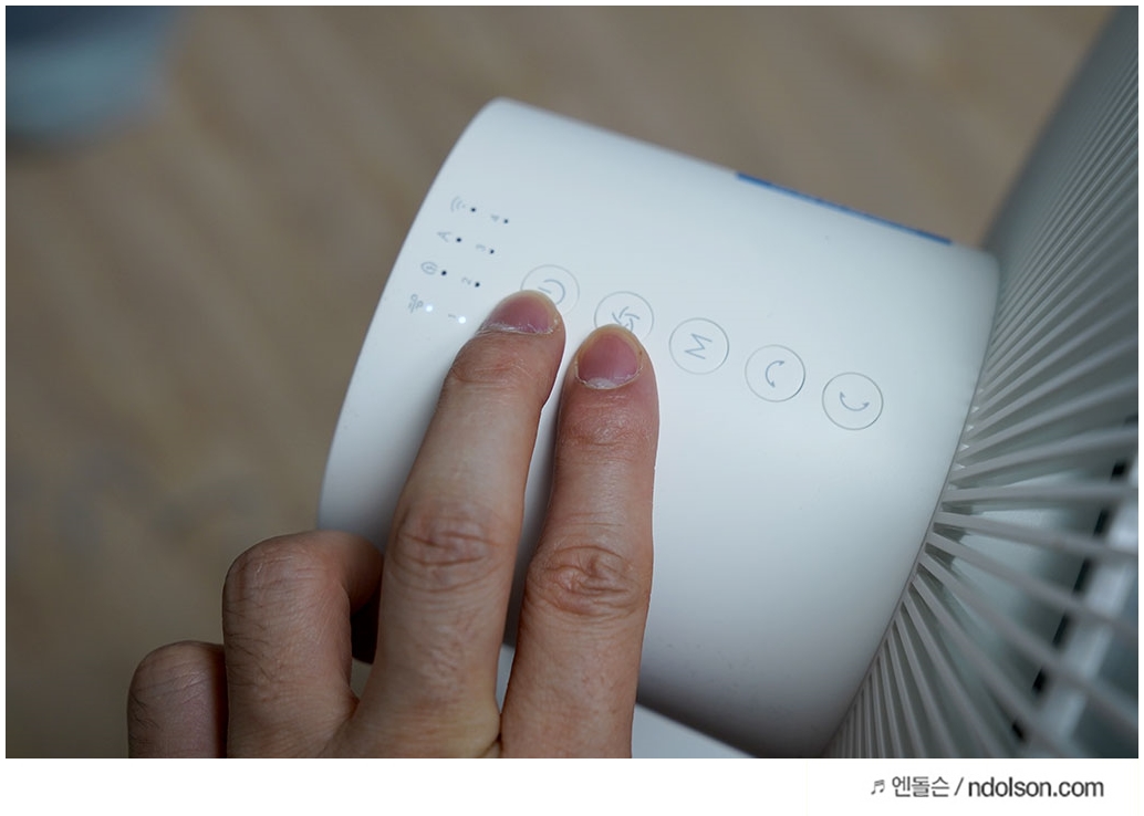 리모컨이 없더라도 샤오미 선풍기를 조정하기 좋습니다. 다이렉트, 뉴추얼, 스마트, 수면풍까지 다양한 바람의 모드가 있습니다.