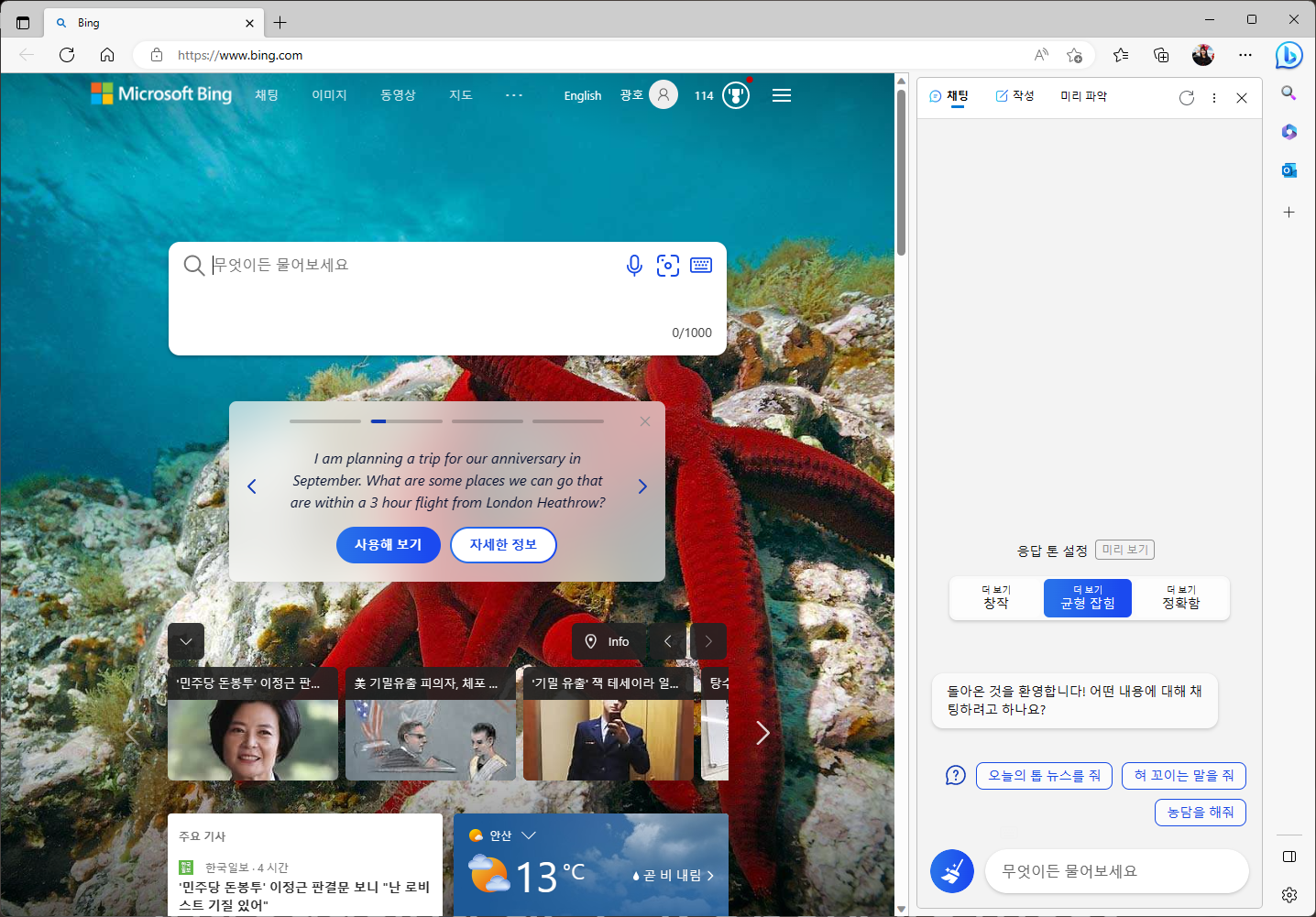 엣지 브라우저의 챗GPT는 4.0이 무료로 사용할 수 있습니다. 창은 검색해서 키워서 볼 수 있습니다.