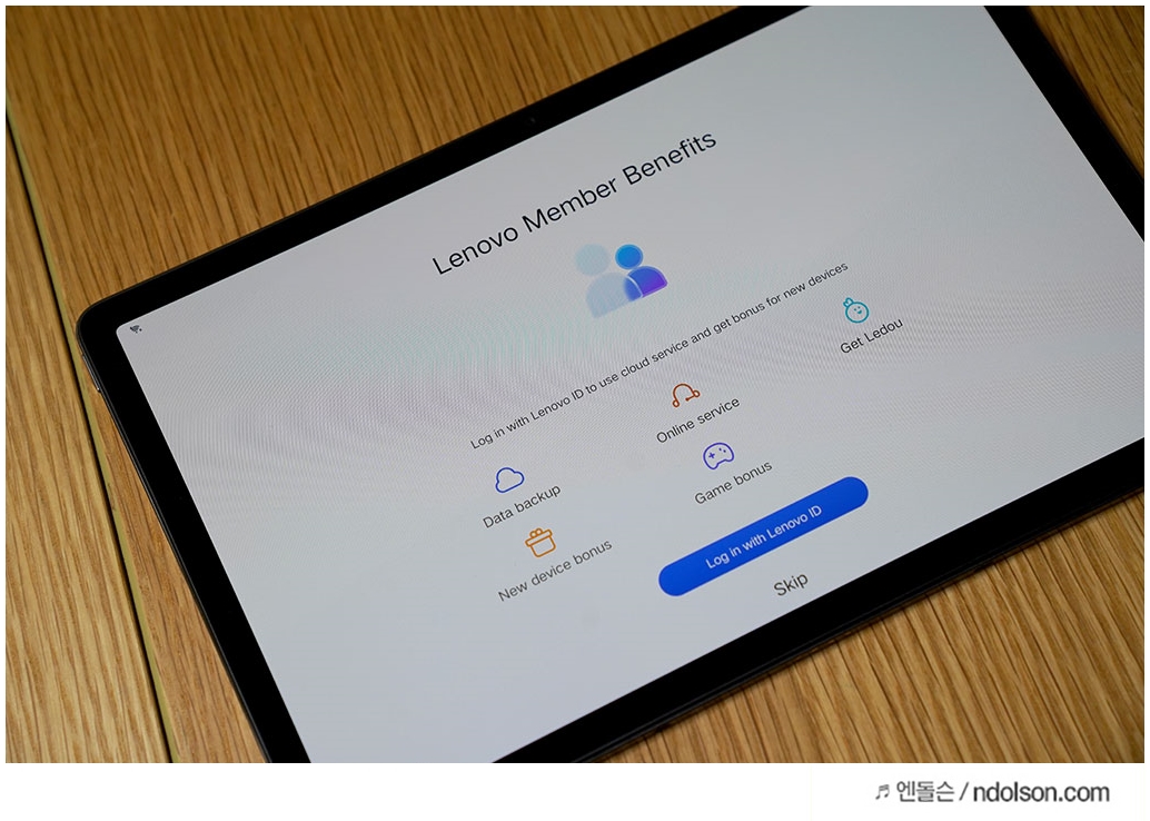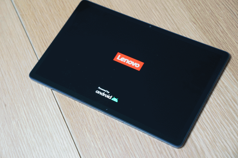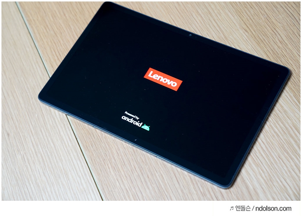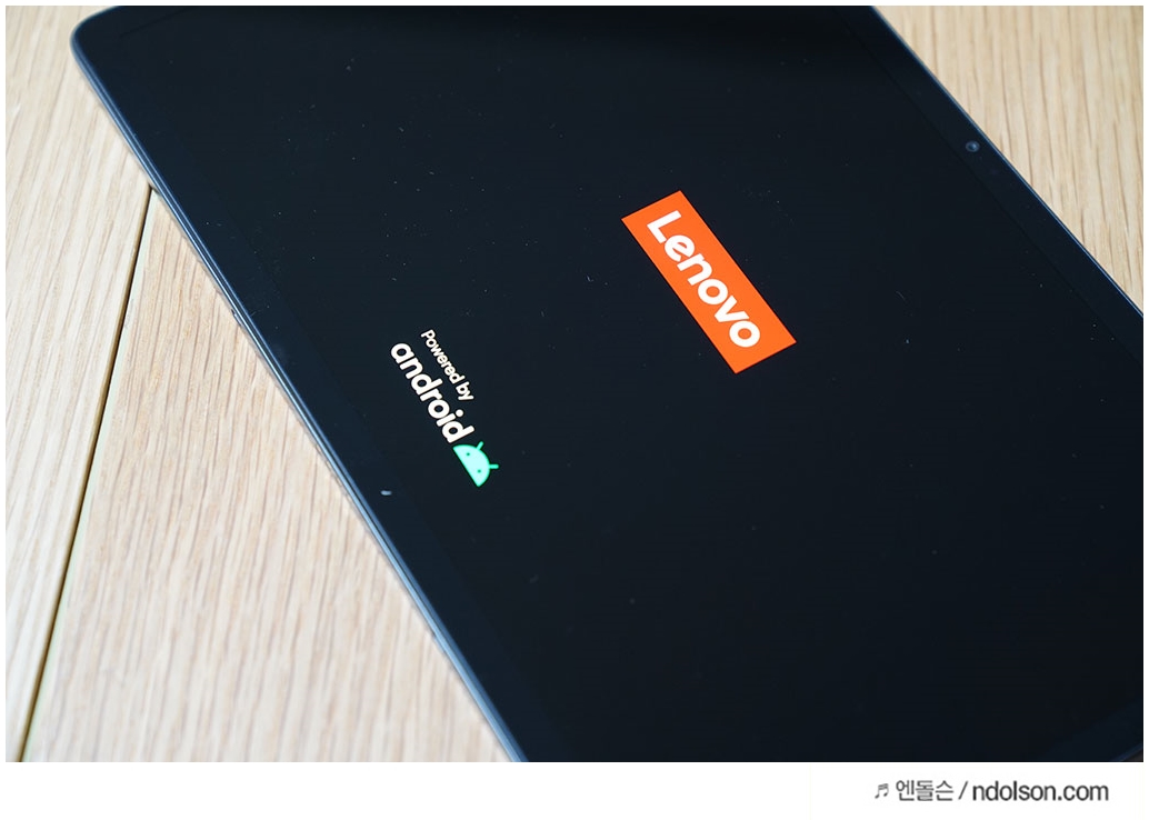 레노버 태블릿을 켜봅니다. Lenovo 로고가 보입니다. 안드로이드 로고도 보이네요.