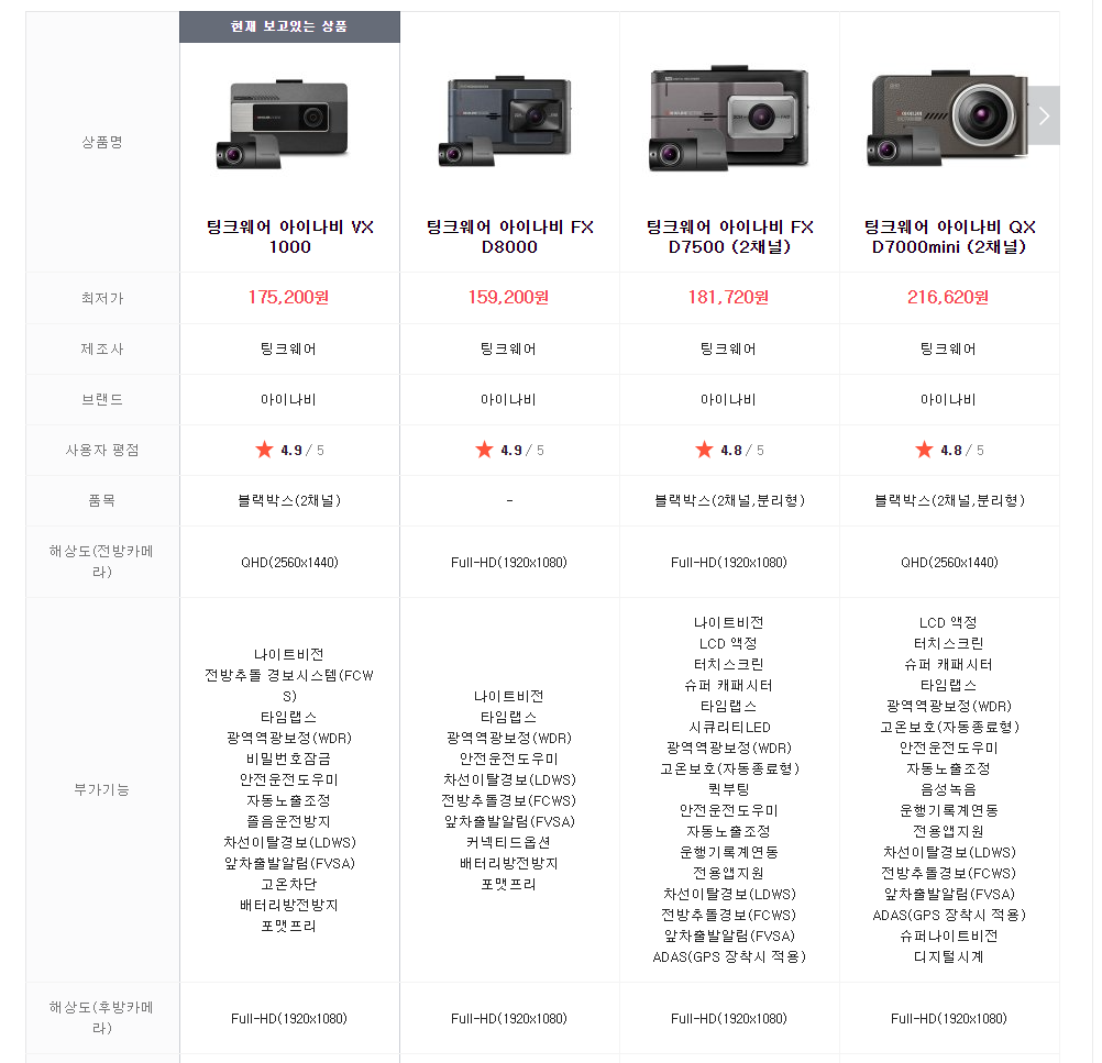 그럼 지금 구매할 수 있는 아이나비 블랙박스는 무엇이 있을지 추천해보겠습니다. QXD8000 또는 VX1000 모델도 좋겠습니다. FHD 이상의 2채널 또 운전보조 기능이 많은 제품이 편해서 좋습니다.