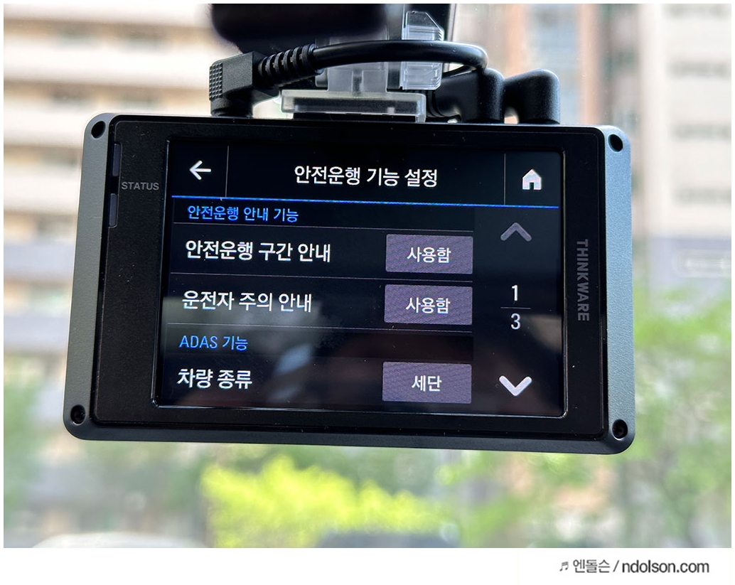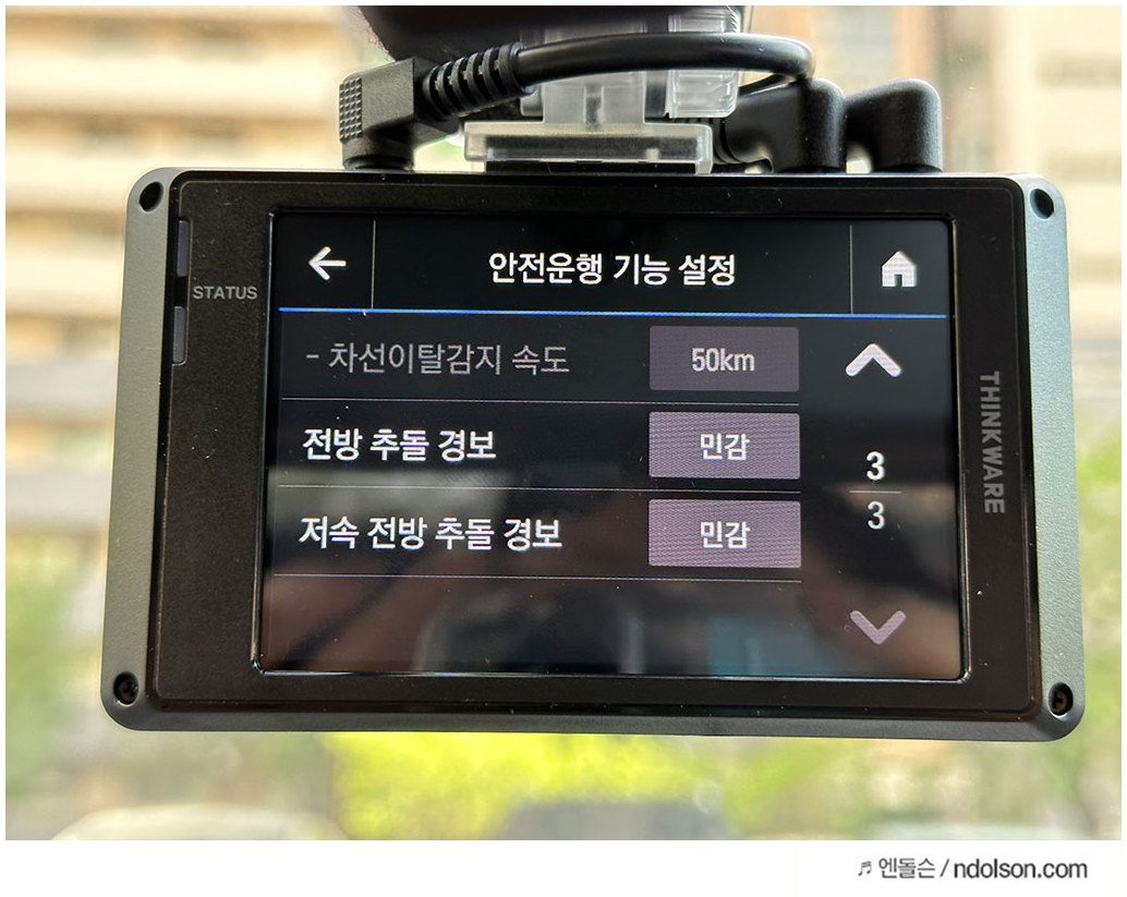 아이나비 블랙박스에서 ADAS 기능의 차선이탈 감지와 앞차 출발 알림, 전방 추돌 경보 기능을 사용함으로 설정하였고 민감 정도를 설정하였습니다.