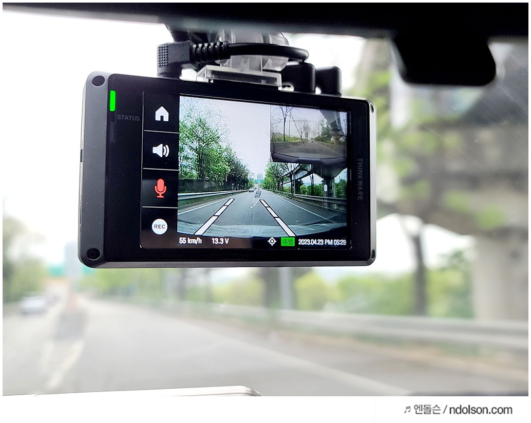 아이나비 블랙박스가 보고 있다가 차선이 이탈하게 되면 경고음과 함께 화면에 빨간줄이 표시됩니다. 사용자는 졸음운전을 하거나 전방 주시 태만일 때 경각심을 가질 수 있어 좋습니다.