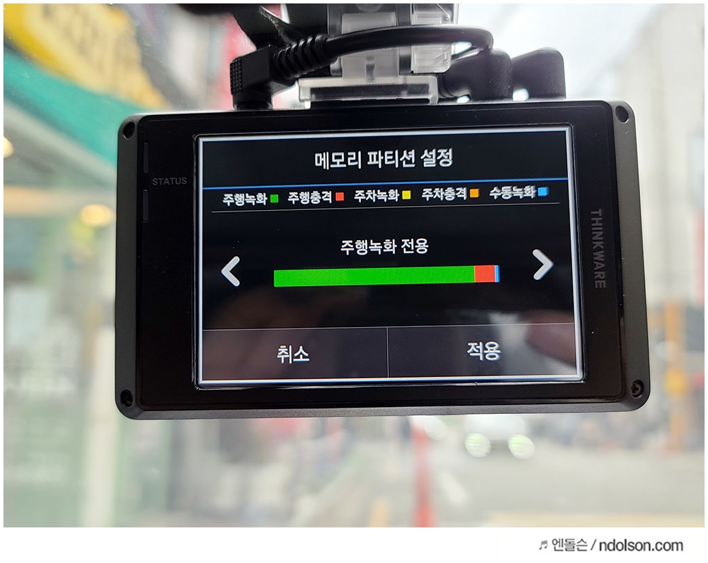 또 블랙박스의 메모리 설정을 주차, 주행, 수동, 충격 등의 비중으로 조절할 수 있습니다. 자신의 라이프스타일에 따라 조정해 주면 메모리 용량의 비중이 달라지게 되는 것이죠. 잘 모르겠다면 권장 설정이 좋습니다.