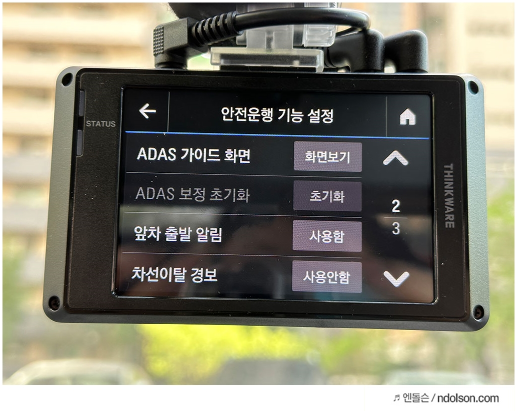 아이나비 블랙박스에서 ADAS 기능의 차선이탈 감지와 앞차 출발 알림, 전방 추돌 경보 기능을 사용함으로 설정하였고 민감 정도를 설정하였습니다.