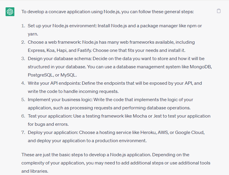 Node.js 환경 설정: Node.js와 npm 또는 yarn 같은 패키지 관리자를 설치합니다.웹 프레임워크 선택: Node.js에는 Express, Koa, Hapi 및 Fastify를 포함하여 사용 가능한 많은 웹 프레임워크가 있습니다. 필요에 맞는 것을 선택하고 설치하십시오.데이터베이스 스키마 설계: 저장하려는 데이터와 데이터베이스에서 데이터가 구조화되는 방식을 결정합니다. MongoDB, PostgreSQL 또는 MySQL과 같은 데이터베이스 관리 시스템을 사용할 수 있습니다.API 엔드포인트 작성: API에 의해 노출될 엔드포인트를 정의하고 들어오는 요청을 처리하는 코드를 작성합니다.비즈니스 로직 구현: 요청 처리 및 데이터베이스 작업 수행과 같은 애플리케이션의 로직을 구현하는 코드를 작성합니다.애플리케이션 테스트: Mocha 또는 Jest와 같은 테스트 프레임워크를 사용하여 애플리케이션의 버그 및 오류를 테스트합니다.애플리케이션 배포: Heroku, AWS 또는 Google Cloud와 같은 호스팅 서비스를 선택하고 애플리케이션을 프로덕션 환경에 배포합니다.