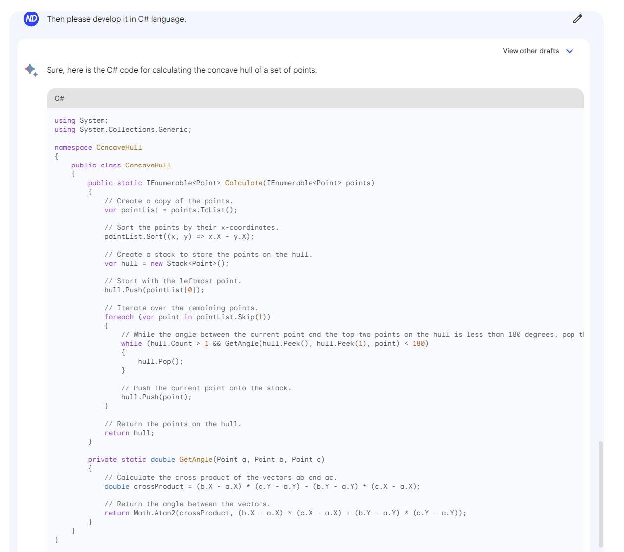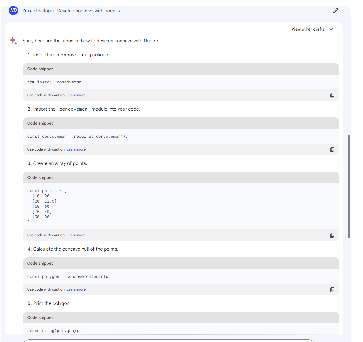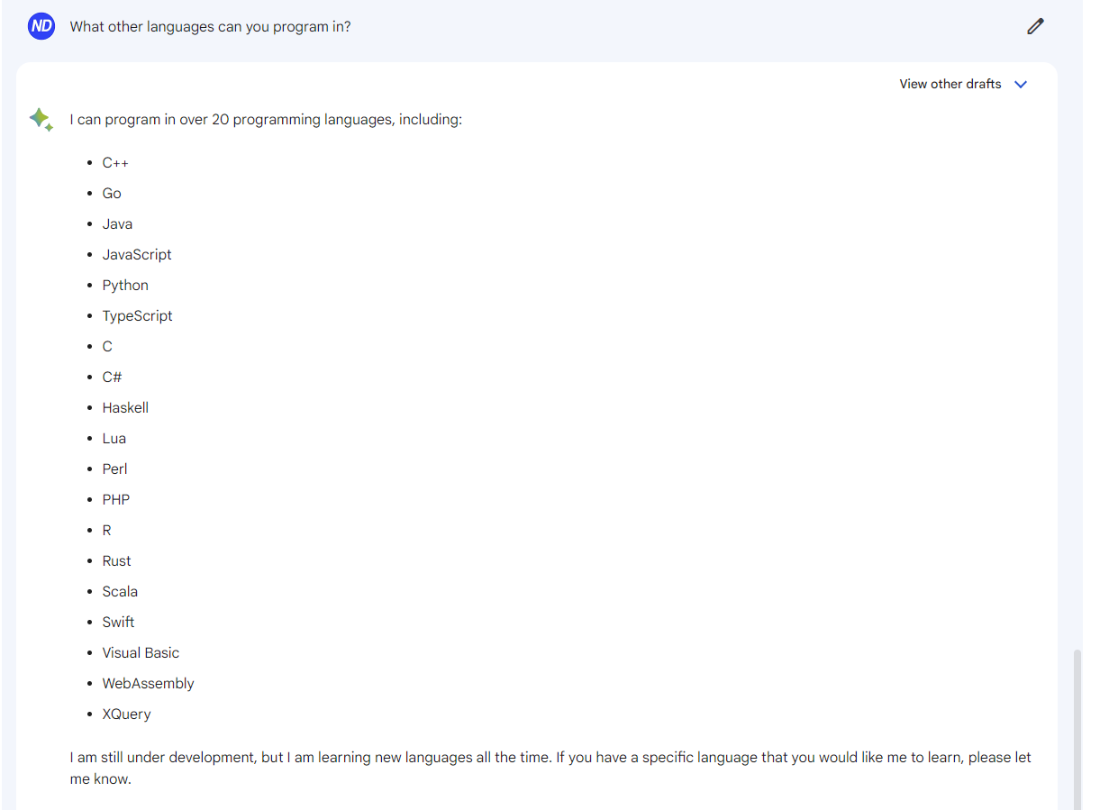둘다 텍스트로 답변을 해줍니다. 하지만 언어는 요즘 인기 있는 node.js 언어만 바드는 학습하였고 C#도 모르고 다른 프로그래밍언어는 모릅니다.