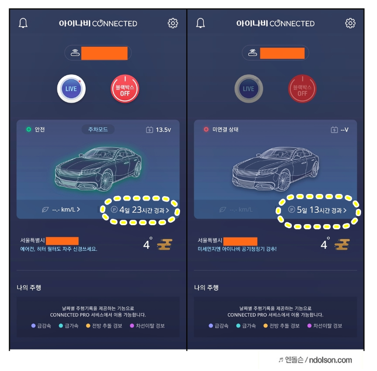 필자가 사용하는 아이나비 VX1000 블랙박스 모델은 자동차 블랙박스 전문 업체인 아이나비 제품으로 커넥티드(아이나비 커넥티드 스탠다드 플러스)가 지원되는 모델입니다. 그래서 자동차의 충격을 실시간으로 알 수 있고, 주차 장소 위치를 쉽게 찾을 수 있게 앱으로 위치 추적도 가능합니다.