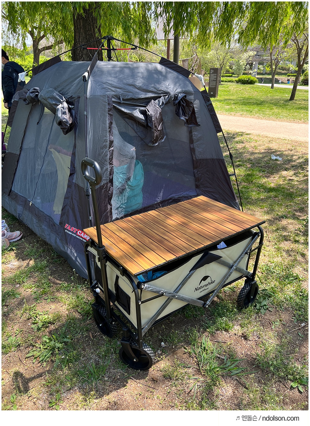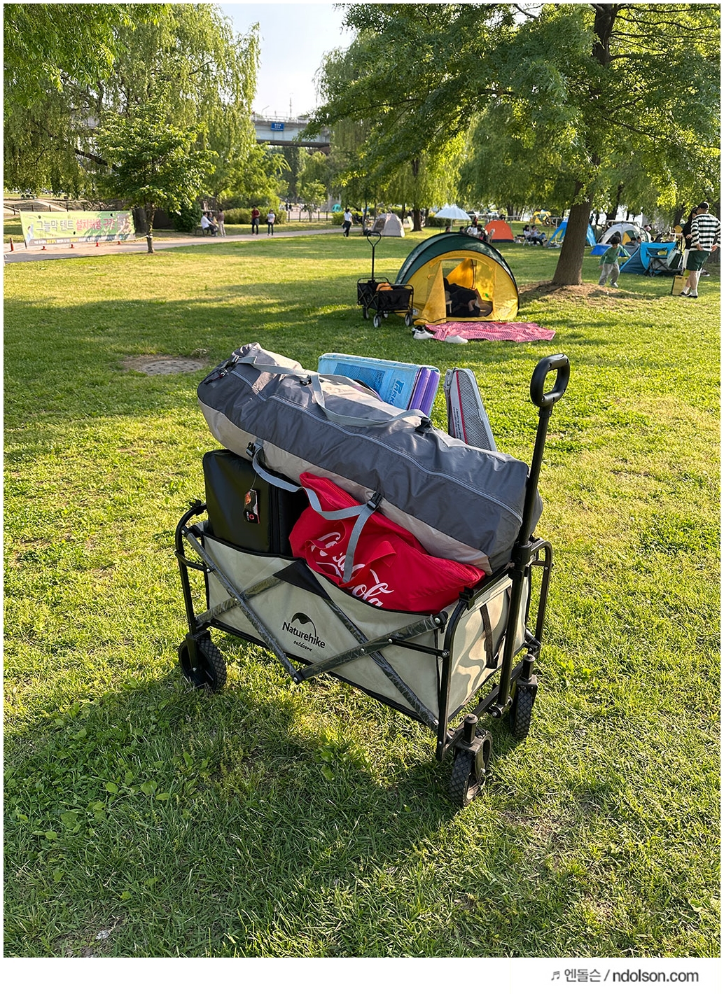 집에서 한강공원까지 멀지는 않지만, 캠핑 텐트, 의자, 돗자리, 간식 등을 챙기다보면 짐이 너무 많습니다. 이럴 때 유용한 게 웨건입니다.