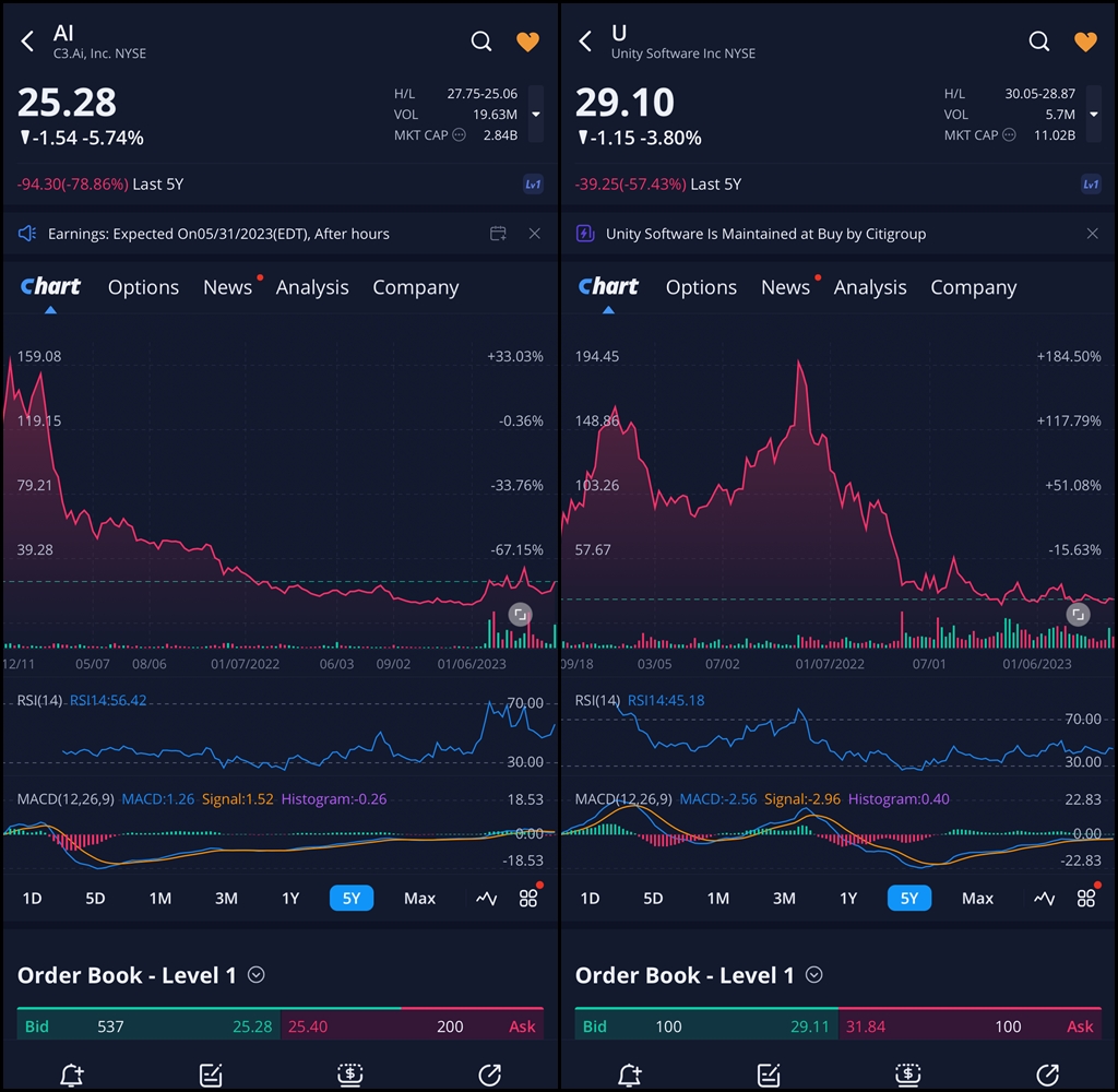대표적인 게 AI(C3)와 U(Unity Software Inc)입니다. 인공지능과 메타버스로 대표되는 기업인데, 투자하다가 접었네요. 역시 마음이 못 버티고 이렇게 오르락내리락하니 미치겠네요.
