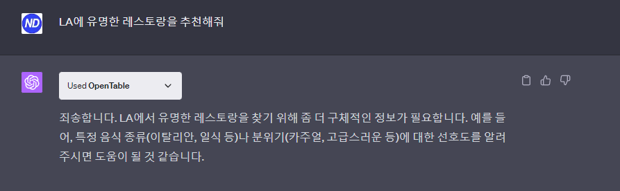 chat GPT에게 "LA에 유명한 소고기 레스토랑을 추천해 줘!"