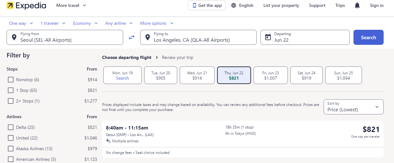 챗GPT에 나온 링크를 누르면 바로 Expedia의 항공권 결제 사이트로 이동하게 됩니다.