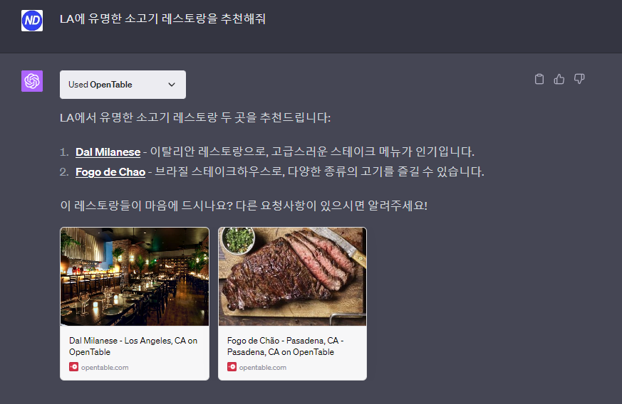 OpenTable 플로그인을 사용하여 예약까지 해줍니다. 또 챗GPT에서 이미지도 보여줍니다.