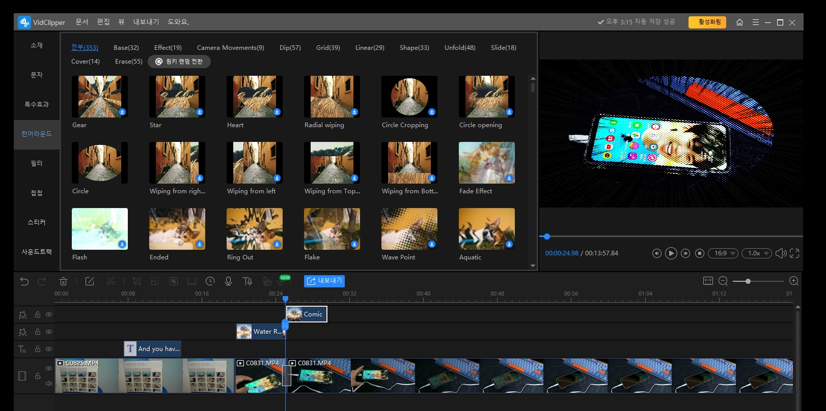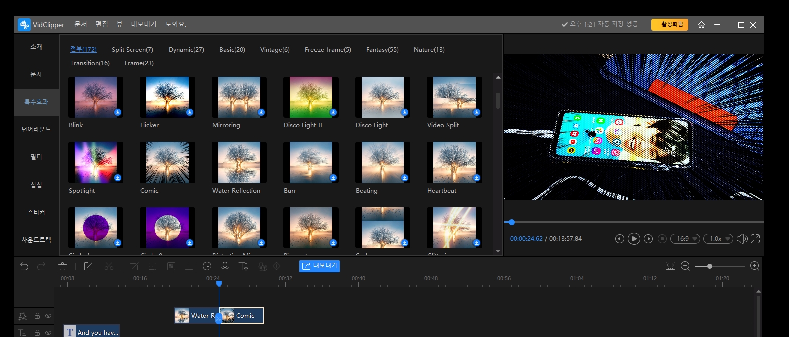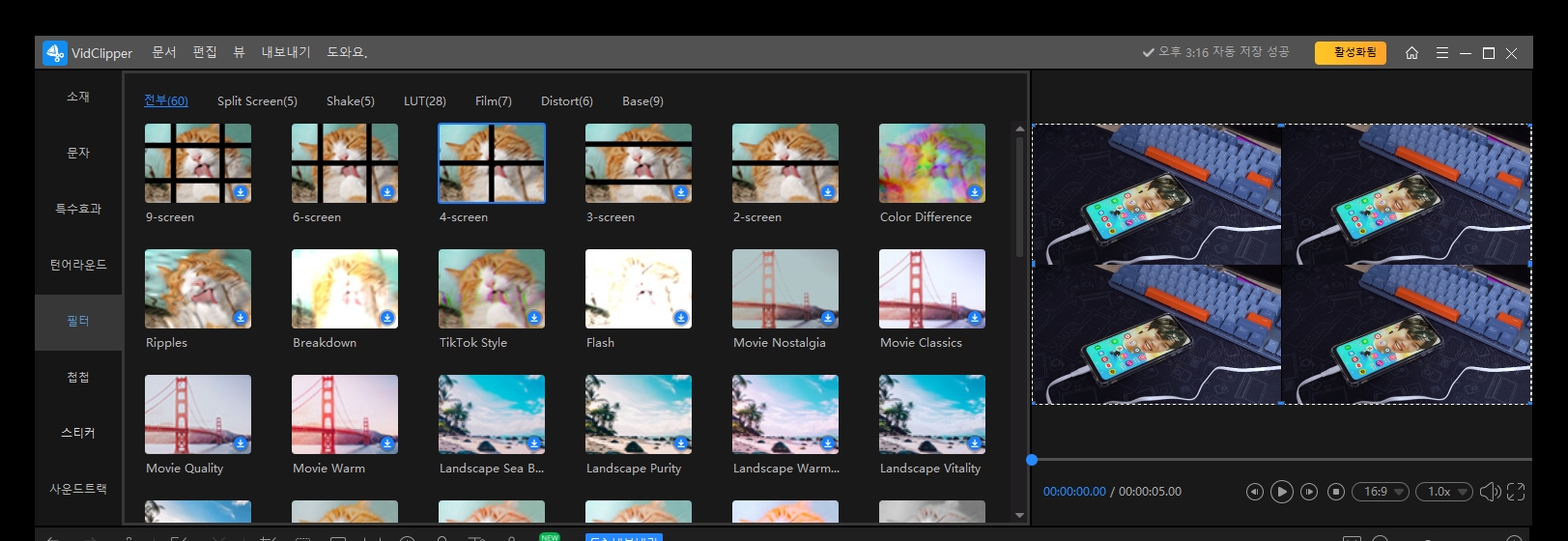 이렇게 영상의 전환할 때 효과도 주고, 영상 자체 필터 효과를 줘서 임팩트 있는 영상을 쉽게 만들 수 있습니다.