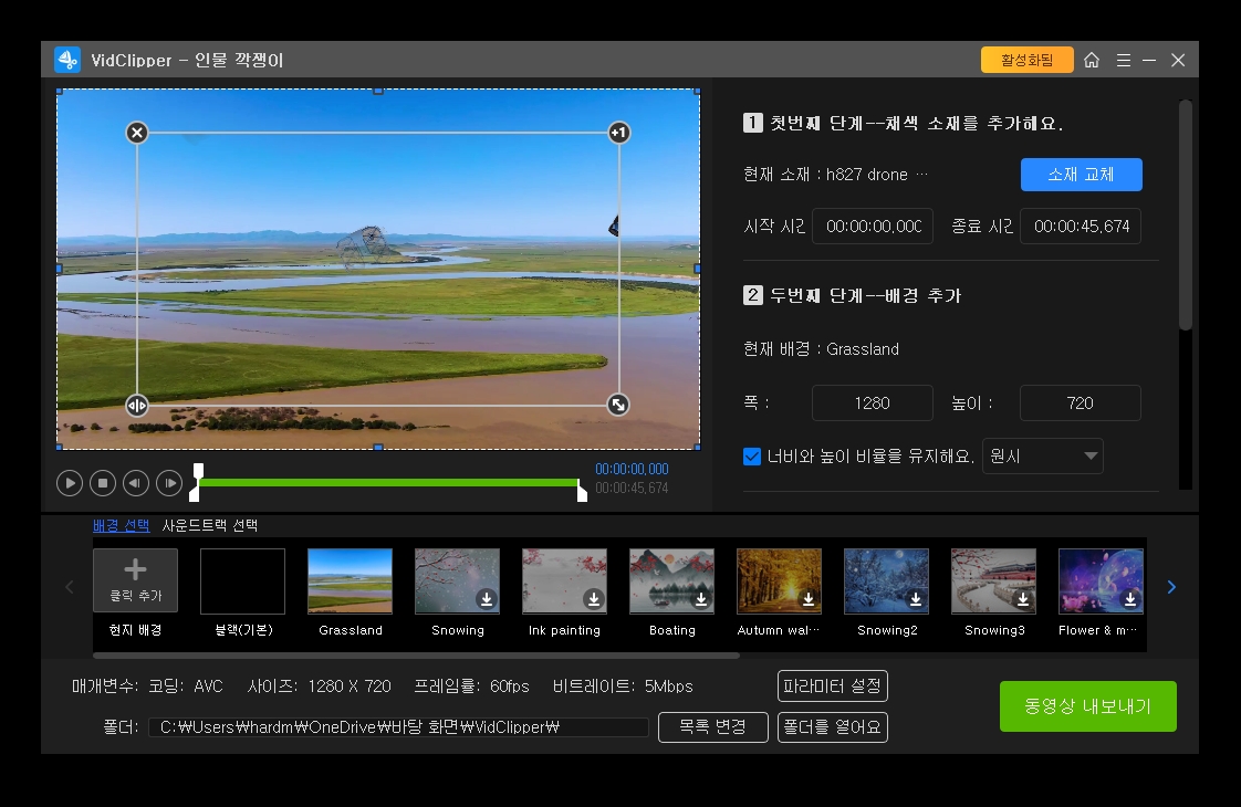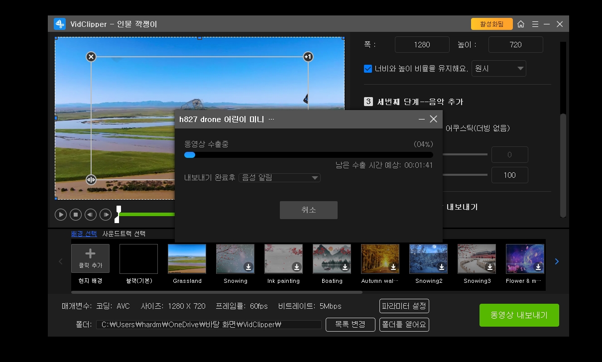 필자의 드론 영상을 넣으니 배경이 바뀌고 드론이 다른 배경에서 떠 다닙니다.