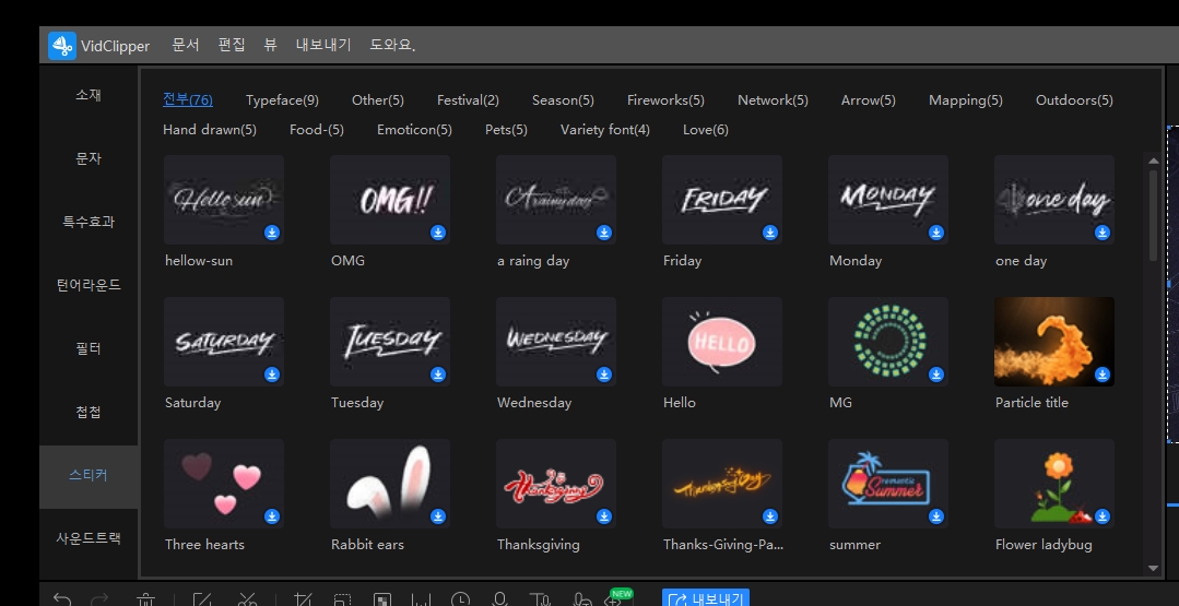 영상에 효과적으로 들어가면 좋은 스티커도 무료로 제공됩니다.