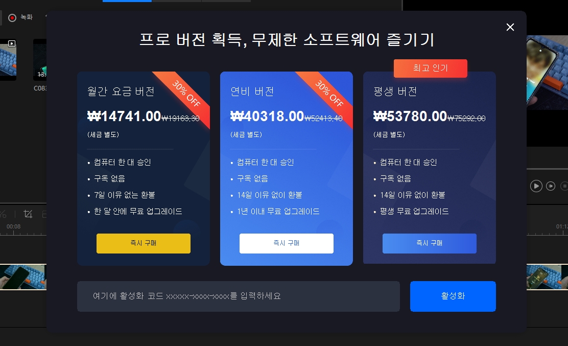 월, 년, 평생 구매 이렇게 3가지 방식으로 구매할 수 있습니다. 월 14000원에 구매해서 사용할 수 있는 구독형도 괜찮네요.