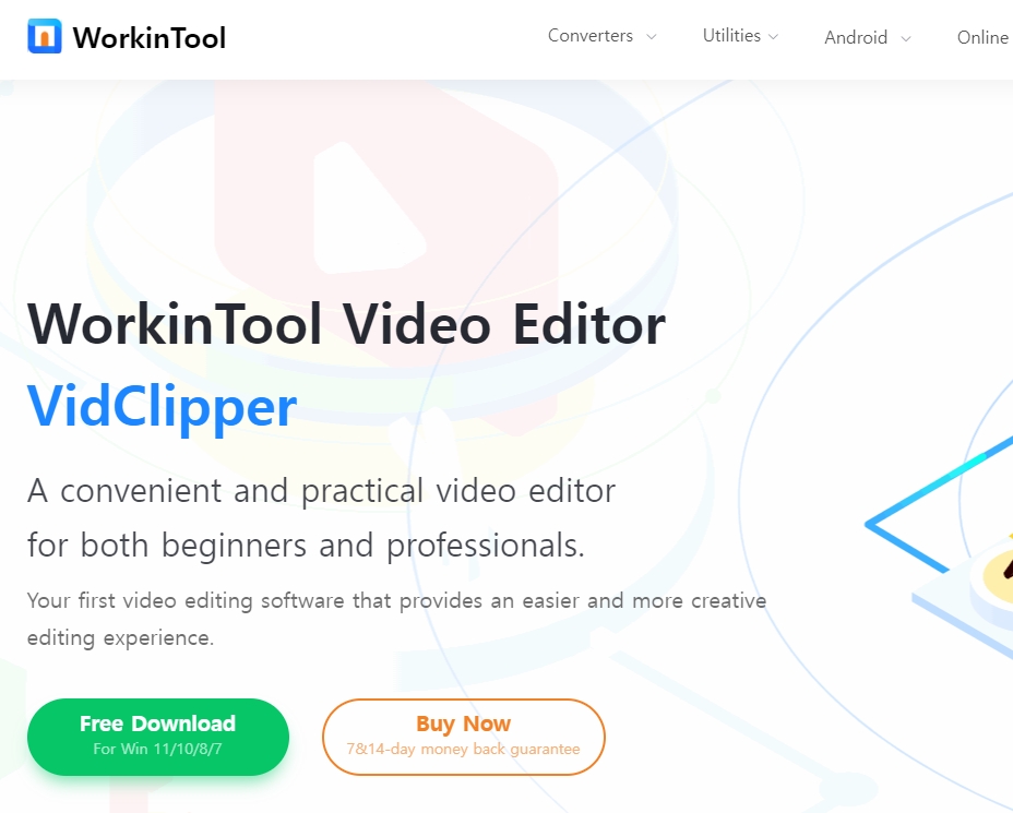 위의 사이트에서 동영상 편집 WorkinTool VidClipper 프로그램을 무료로 다운로드 받을 수 있습니다. 무료는 제약이 있지만, 일부 기능은 사용이 가능합니다. 구매 전에 먼저 사용해 보는 것이죠.