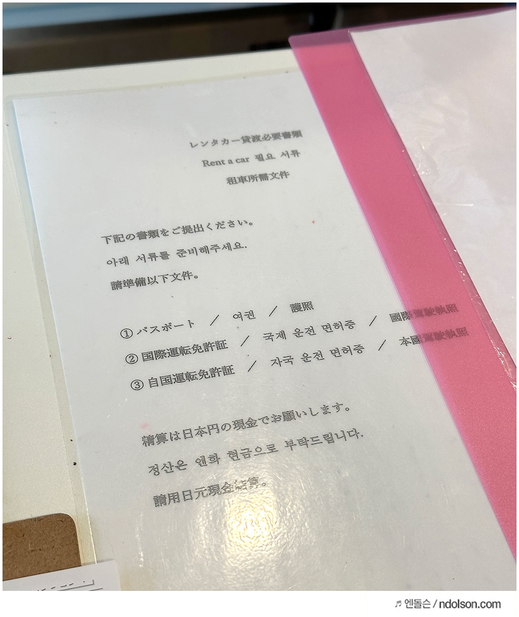 일본 렌트카를 빌리려면, 국제 면허증, 운전면허증, 여권이 있어야 합니다.