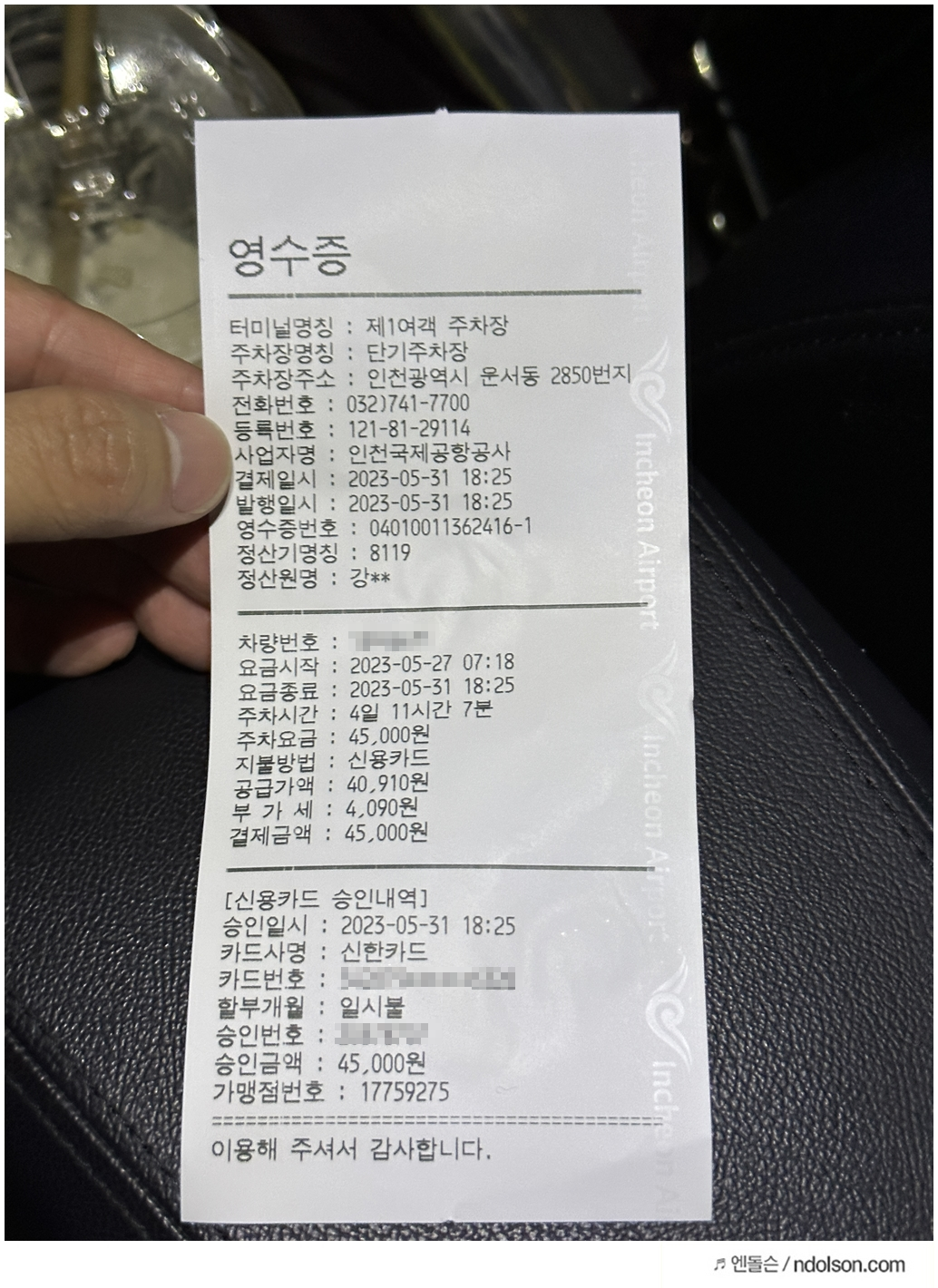 인천공항 주차장을 이용한 요금은 45,000원 입니다.