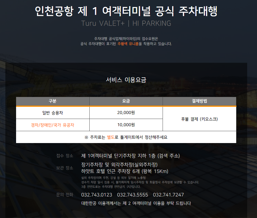 인천공항 제1터미널 공식주차대행 발렛 하이파킹 후기 주차비