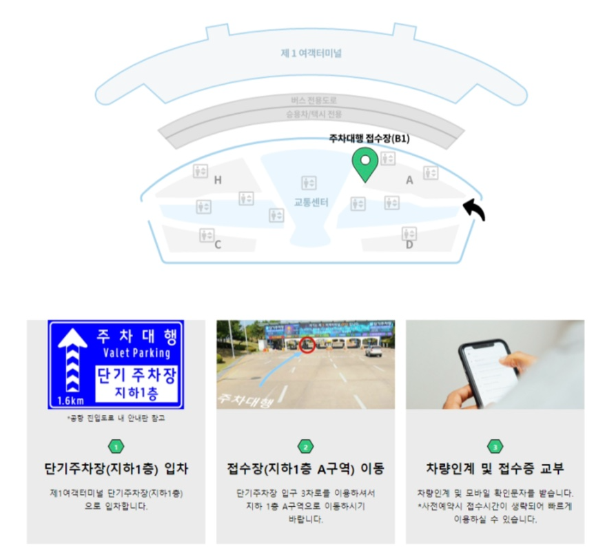 1 터미널로 이동 > 지하 1층 단기주차장 주차대행으로 입장 > 차량 인계 > 비행기로~