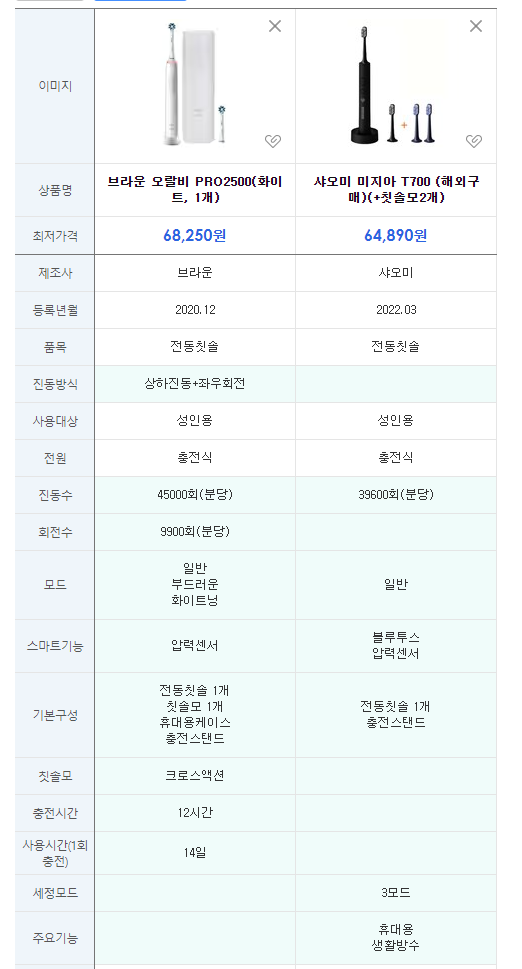 * 오랄비 전동칫솔보다 모드와 기능이 적음