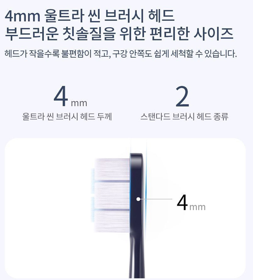 칫솔모는 DuPont™ Staclean® 칫솔모로 FDA 기준 테스트를 통과한 안전한 소재입니다. 0.127mm의 강모 지름과 0.152mm의 내부 강보 지름으로 잇몸과 치아 구석까지 완벽한 세척을 할 수 있습니다. 또한, 칫솔 헤드를 4mm로 얇게 만들어 구강 안쪽까지 불편함 없이 사용할 수 있습니다.