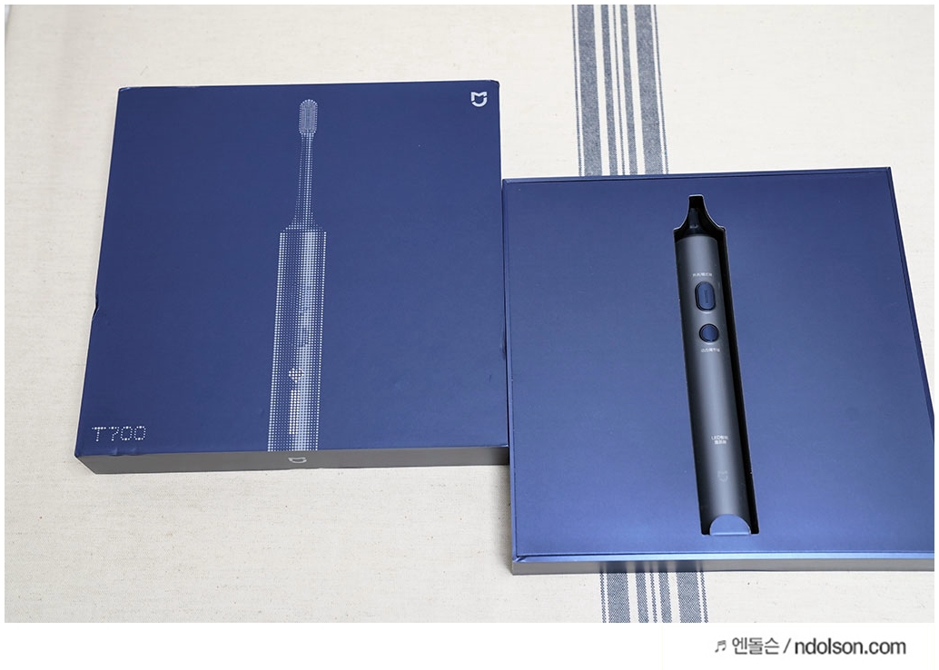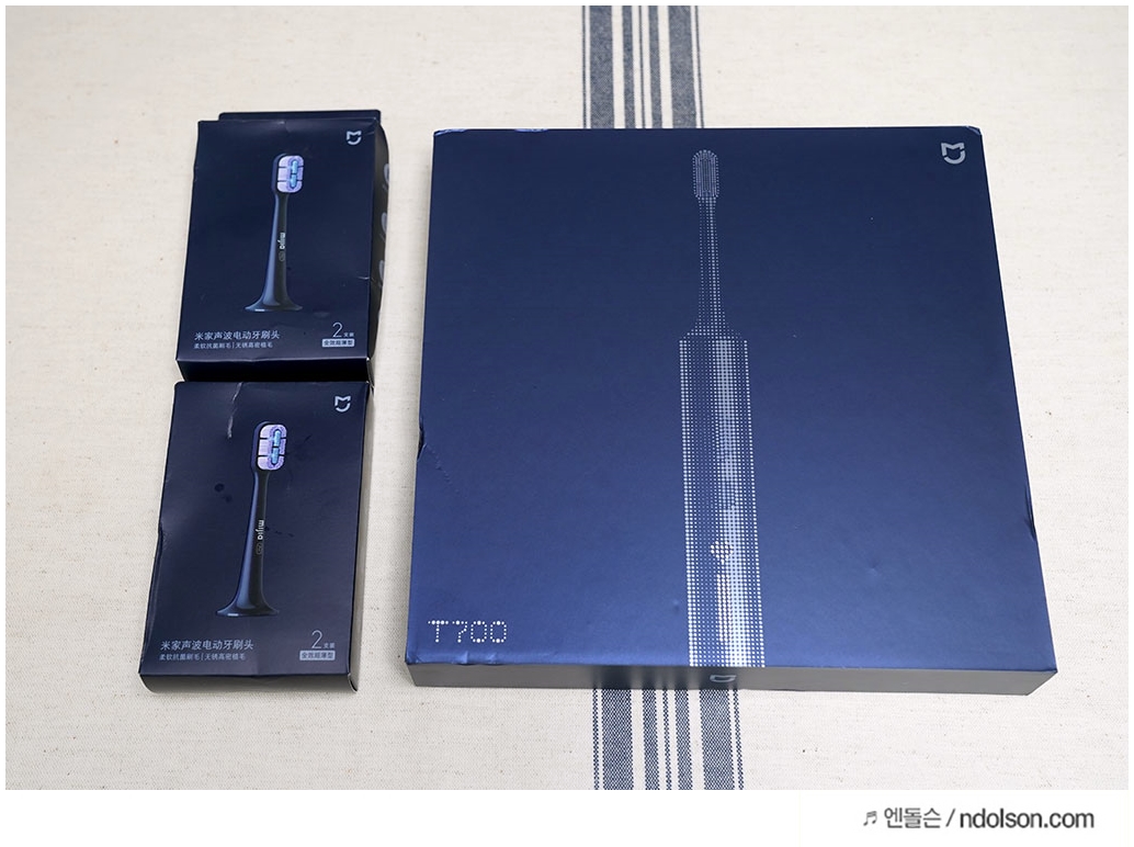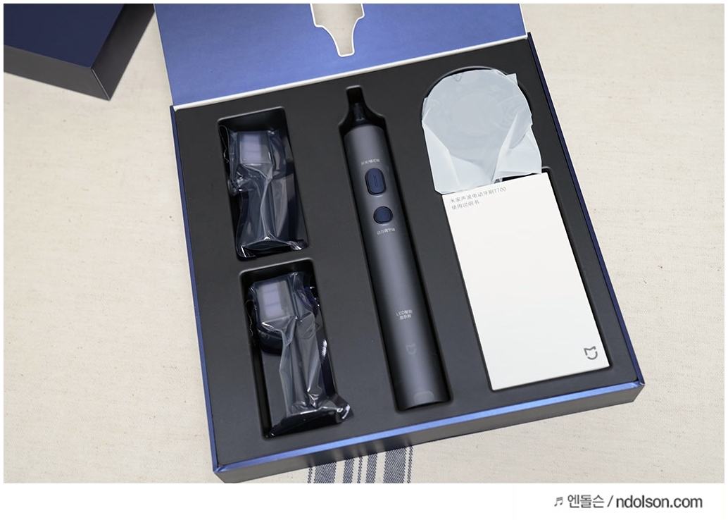 샤오미 전동칫솔 T700을 개봉했습니다. 2개의 여분 칫솔모가 있고, 매뉴얼과 전동칫솔이 있습니다. 패키지는 남색으로 깔끔합니다.