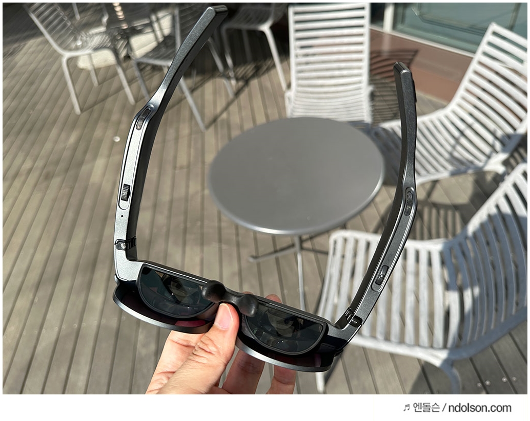 무게도 가벼운 82g로 가벼워 일상적인 착용에서도 부담 없이 사용할 수 있습니다. 스마트안경을 연결하기 위한 선은 마그네틱 커넥터를 통해 간편하게 연결할 수 있습니다. 이 제품은 선글라스 부분을 분리하여 주변 사물을 식별하면서 걷는 것도 조금은 가능합니다. 하지만 움직이지 않은 공간에서 AR글래스를 사용하는 게 더 좋습니다.