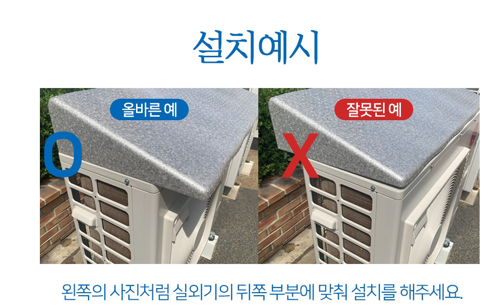 왼쪽 사진처럼 실외기 위의 끝을 맞추어 지붕이 밖으로 나가게 설치하면 됩니다.