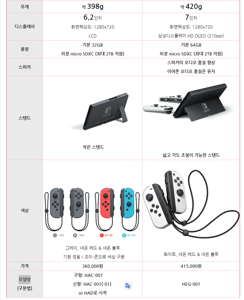 개인적으로 닌텐도 스위치 OLED 화질이 더 좋아 추천합니다. 또 중고로 팔때 최신형이 뽑기 값을 하기 때문에 좋죠. 한번 살 때 닌텐도 스위치 OLED 화이트를 사던지 네온을 사던지 상관없습니다.