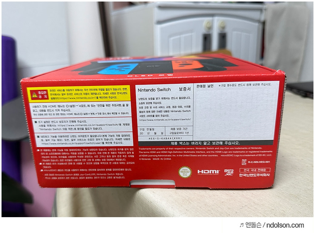 닌텐도 스위치 OLED 네온을 할인해서 샀고, 배송도 빠르고 좋네요. 닌텐도 스위치 OLED은 국내 정발 정품입니다. 나중에 A/S 하러 일본 가기 힘드니, 직구는 안될 것 같아서 정발 샀는데 사길 잘했네요.