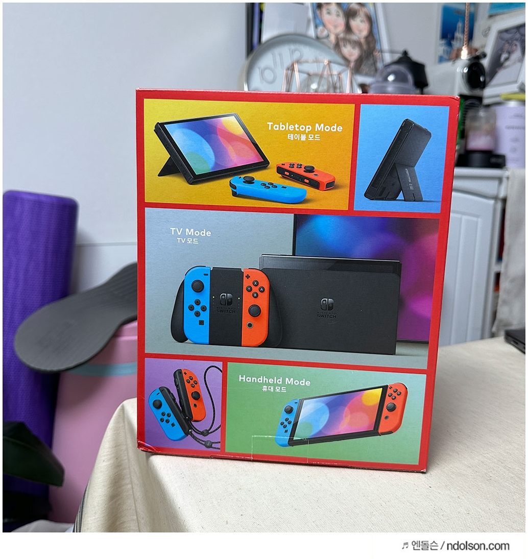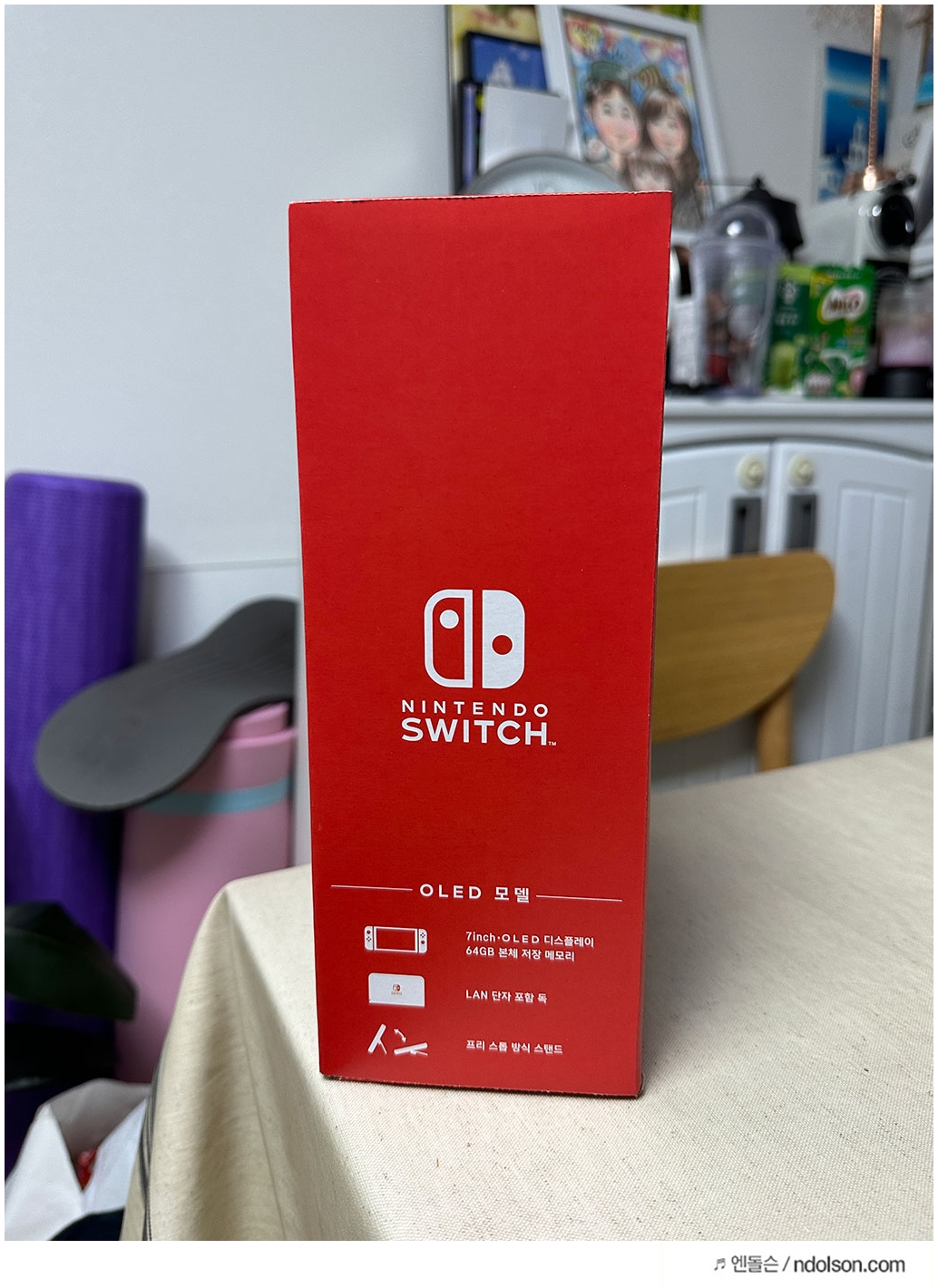 닌텐도 스위치 OLED 네온 버전으로 패키지에는 빨강, 파랑 조이콘이 보입니다.