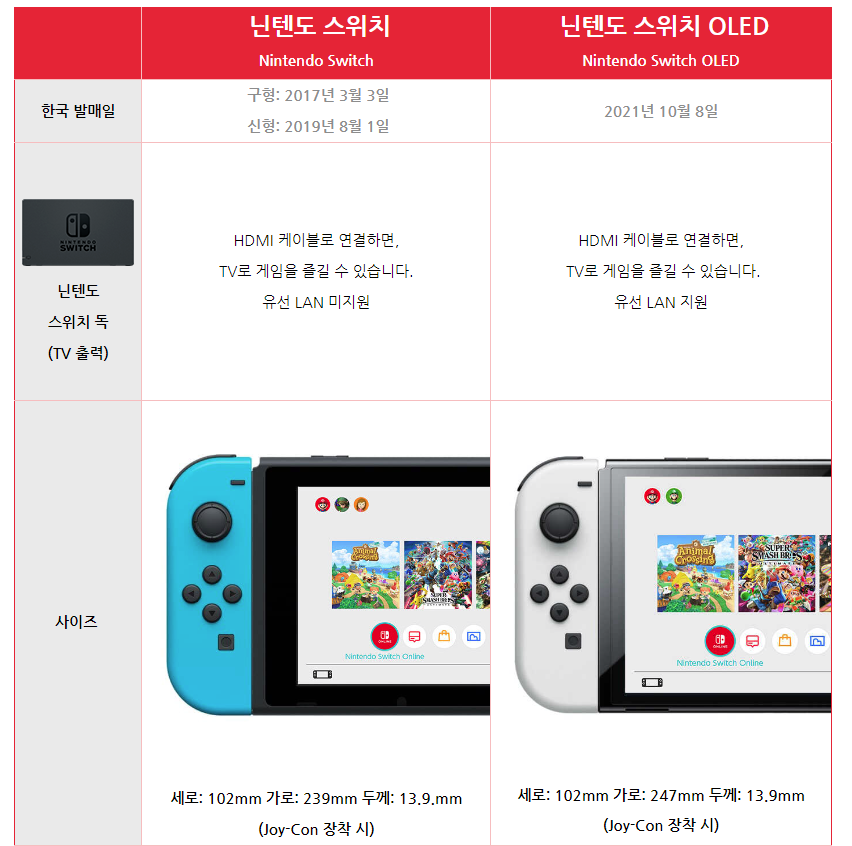 닌텐도 스위치 OLED는 두 가지 모델로 출시됩니다. 하나는 화이트 색상 모델이고, 다른 하나는 네온 레드와 네온 블루 색상 모델입니다. 두 모델의 사양은 동일합니다.