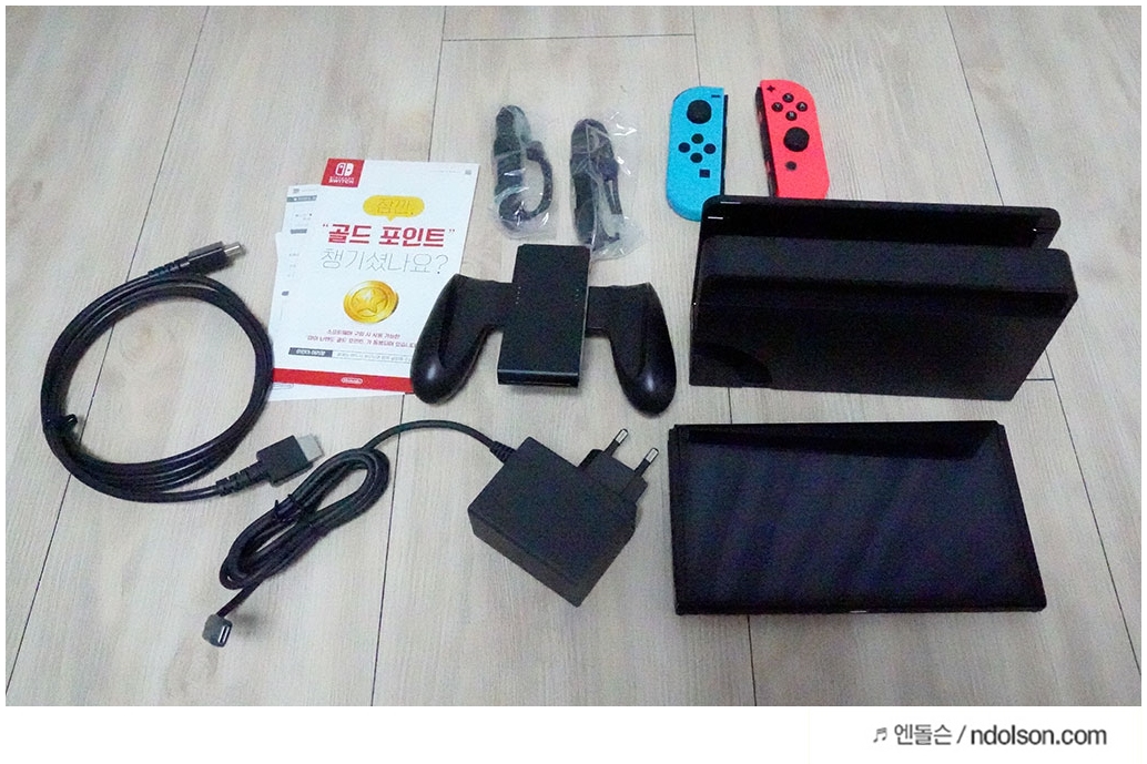 개봉했습니다! 닌텐도 스위치 OLED 개봉기로 구성품 설명을 해보면, 닌텐도 스위치 본체/독, 게임기, 충전기, HDMI 케이블, 조이콘 그립(네온), 스트랩 밴드, AC어답터 충전기, 골드 포인트를 줍니다.