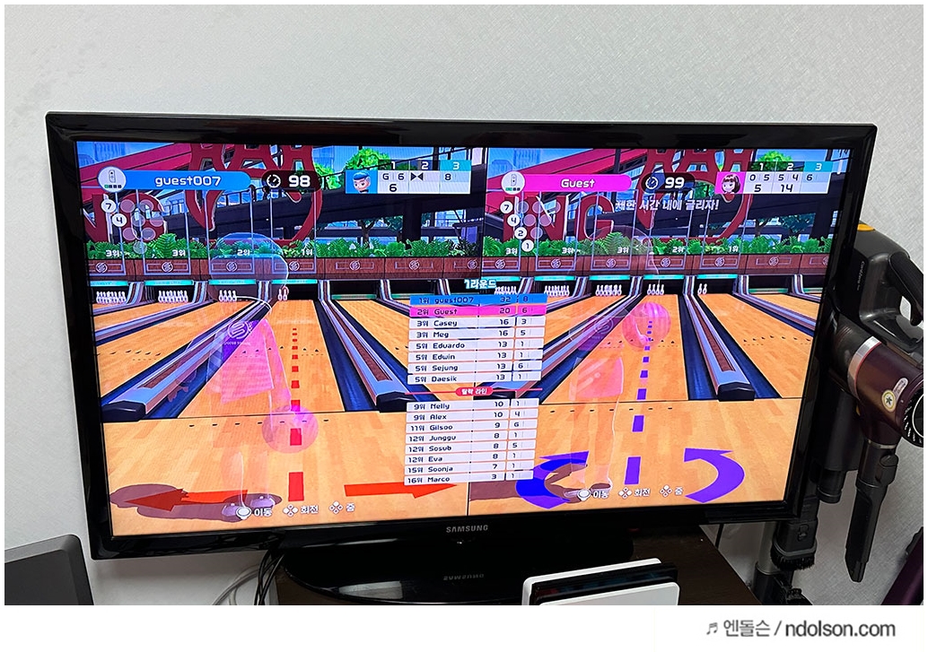 볼링 스포츠는 화면을 분할해서 같이 바로 진행할 수 있어서 게임의 속도도 빠르고 실제 볼링을 하는 것과 유사한 느낌을 받을 수 있었습니다. 공을 굴리는 루트를 설정하거나 손목을 비틀어서 커브를 줄 수 있는 등 자유롭게 플레이할 수 있어서 좋았습니다.