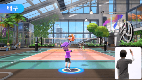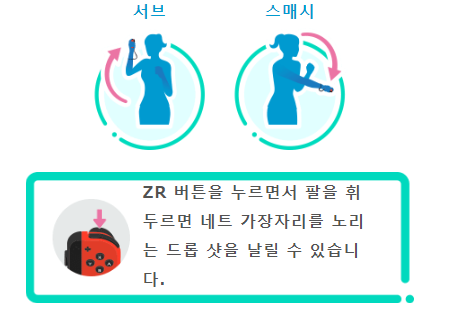 배드민턴 스포츠 게임은 서브와 스매시와 같은 동작을 사용할 수 있습니다. 1:1 대전이 기본 플레이 방식이며, 배구와 다른 점은 ZR 버튼을 추가로 눌러서 드롭샷을 날릴 수 있다는 것입니다.