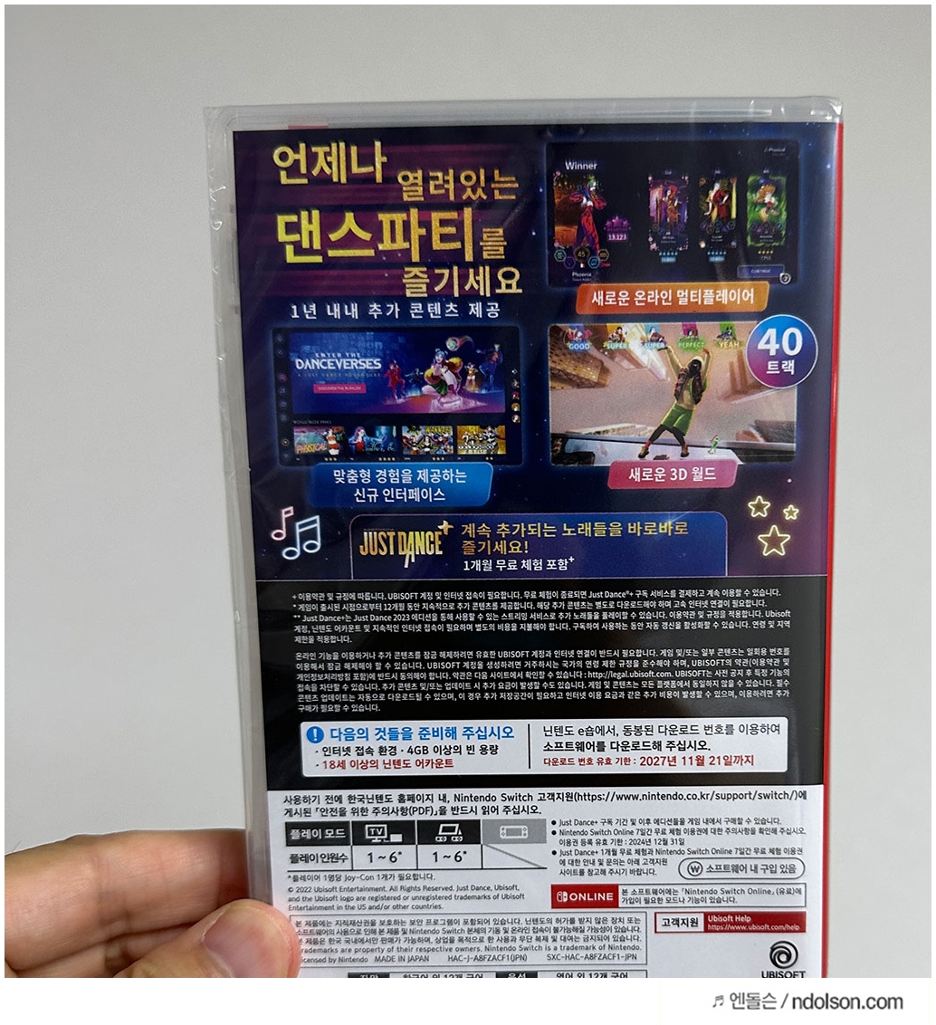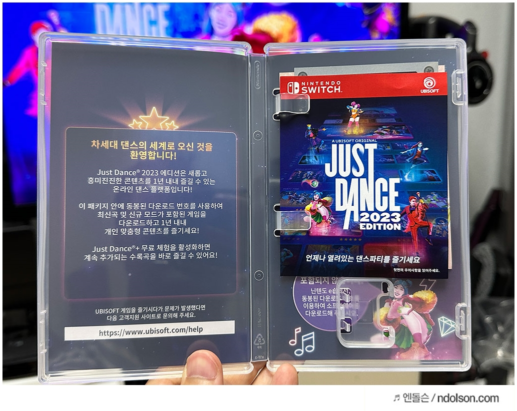 열어 보면, UBISOFT(유비아이소프트)의 저스트댄스 2023 에디션이라고 쓰여 있습니다. 또 2023년 버전에 맞게 매뉴얼도 있습니다. 칩셋은 없습니다. 되팔이가 안됩니다. 뭐 팔생각은 없고 계속 춤 쳐서 다이어트할 생각입니다.