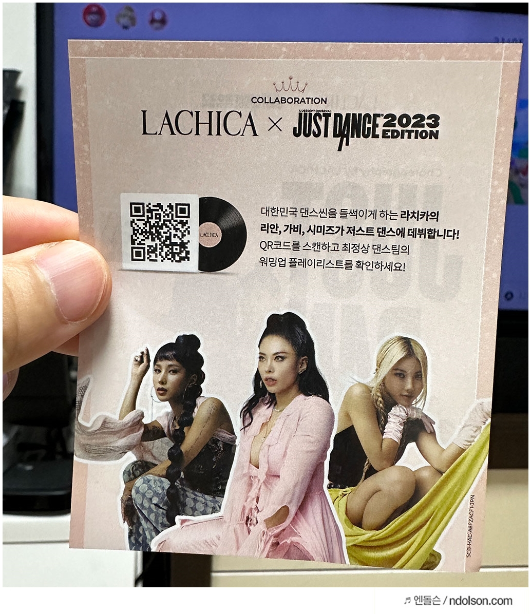 2023 저스트댄스 패키지 안에는 스트릿우먼파이터로 더 잘 알려진 라치카 댄스그룹의 워밍업 플레이 리스트도 있습니다. 라치카는 K팝 그룹의 안무를 잘 짜고 많이 참여하였다는데요. QR코드를 찍어보니, 플레이 리스트로 유명한 노래들이 많더라고요.