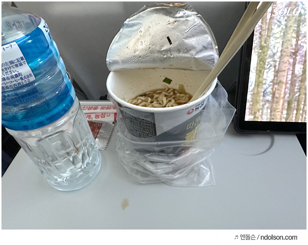 라면은 기내식으로 간편히 먹기 딱 좋은 수준으로 맛이 좋았습니다. 라면의 국물은 진하고 짜지 않았으며, 라면 면발은 쫄깃했습니다. 그런데 물 조금 더 달라고 하면 넣어줍니다.