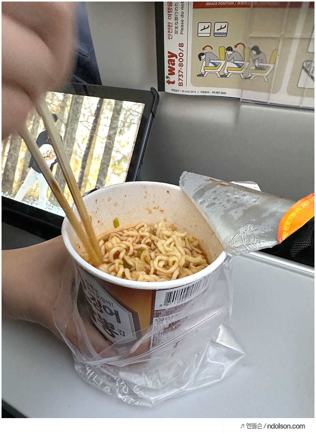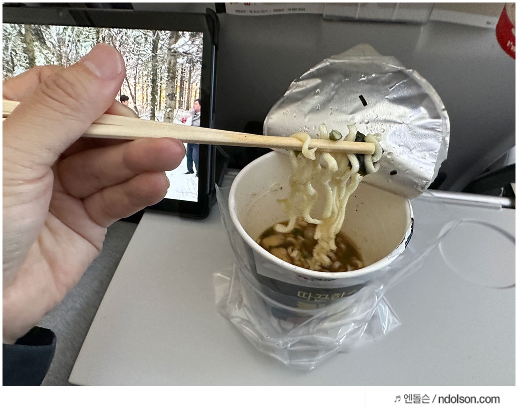 라면은 언제먹어도 질리지 않아요! 비행기라는 밀폐된 공간에서 라면을 먹으니 누가 먹었는지 라면 특유의 냄새 때문에 참을 수 없을겁니다.