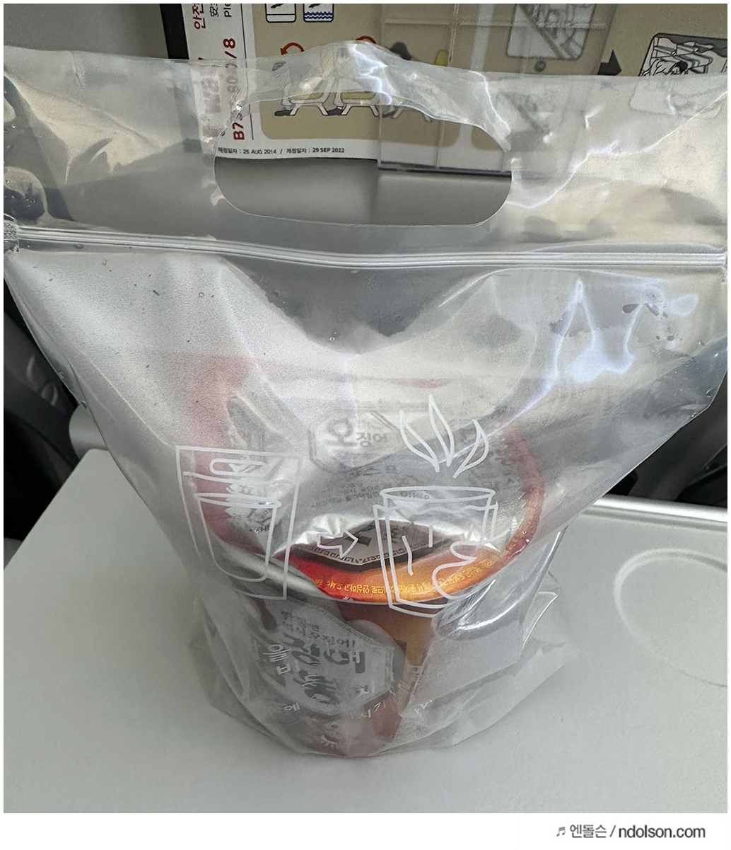 라면은 기내식으로 간편히 먹기 딱 좋은 수준으로 맛이 좋았습니다. 라면의 국물은 진하고 짜지 않았으며, 라면 면발은 쫄깃했습니다. 그런데 물 조금 더 달라고 하면 넣어줍니다.