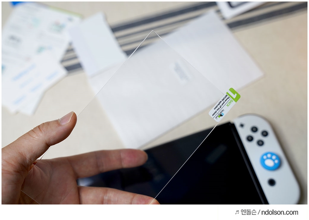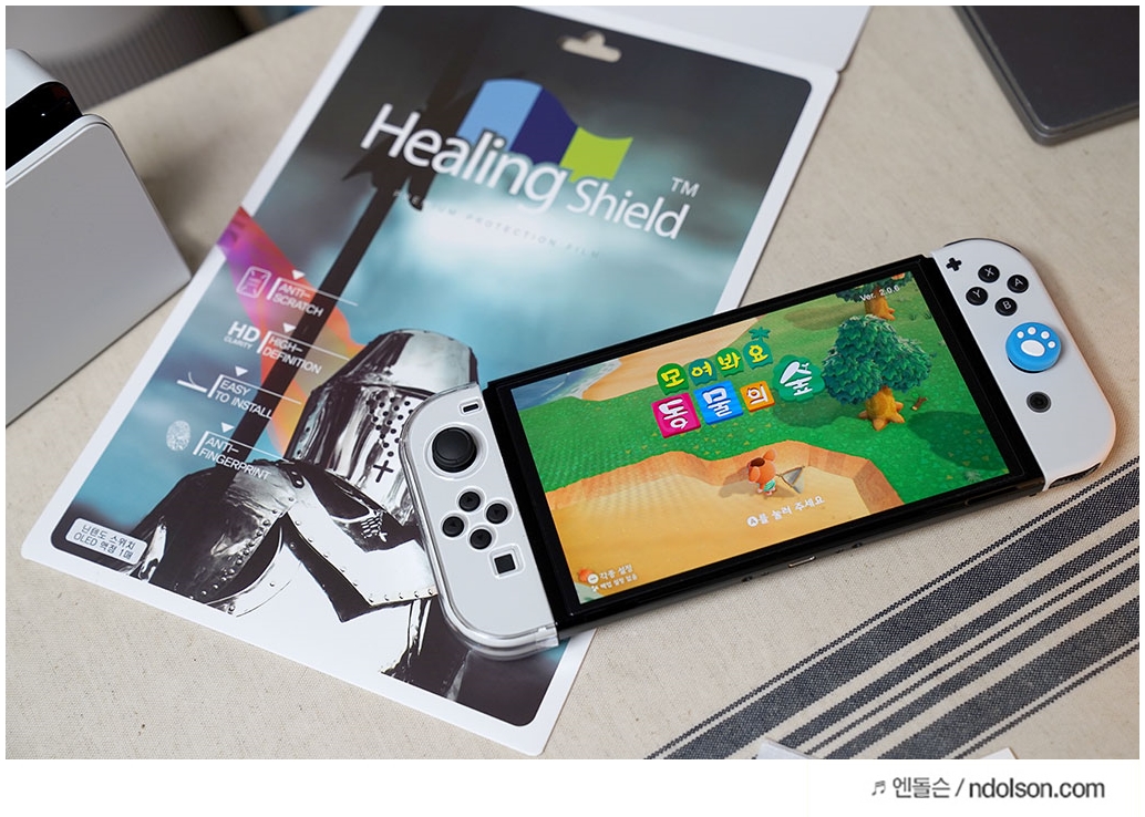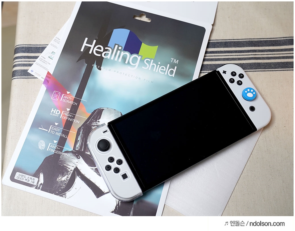 알아보니, 힐링쉴드 닌텐도 스위치 강화유리 필름이 있더라고요! 9H등급에 완전 투명이라 빛 반사 없이 좋아서 셀프로 부착했어요.