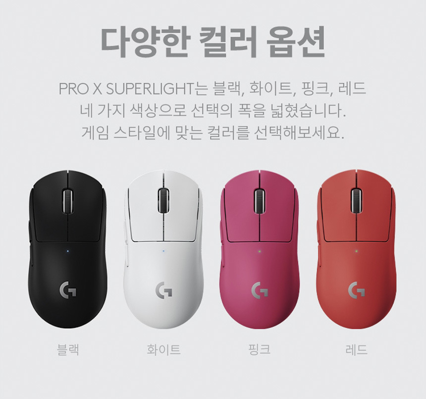 로지텍 G PRO X SUPERLIGHT은 세련된 디자인과 4가지 색상은 화이트, 블랙, 핑크, 레드로 취향별로 골라 볼 수 있습니다. 필자가 사무용, 게임용으로 쓰는 마우스와는 로지텍 G PRO X SUPERLIGHT가 가지는 특성이 다릅니다.