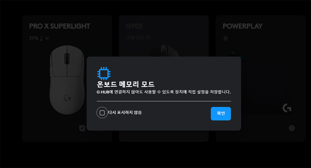 로지텍 온보드 메모리 모드는 로지텍 게이밍 기기에 설정과 프로필을 내부 메모리에 저장하여 G HUB 소프트웨어 없이도 독립적으로 사용할 수 있게 해주는 기능입니다. 필요에 따라서 온보드 메모리 모드를 켜고 끄시면 됩니다. 그래서 외부 소프트웨어 의존성이 줄어들고, 설정이 여러 컴퓨터나 플랫폼에서 유지되어 휴대성과 편의성이 높아집니다.