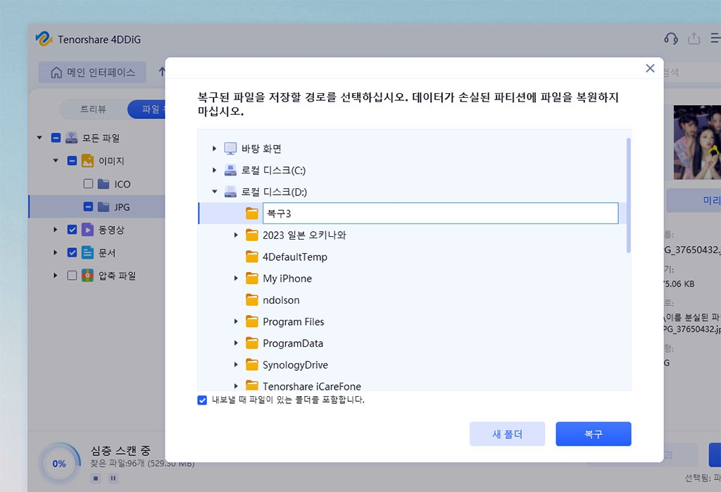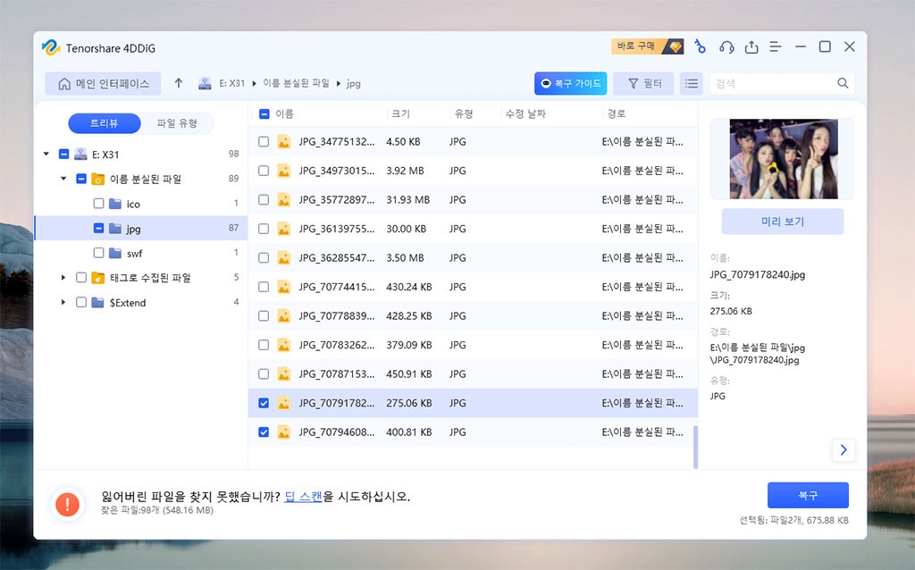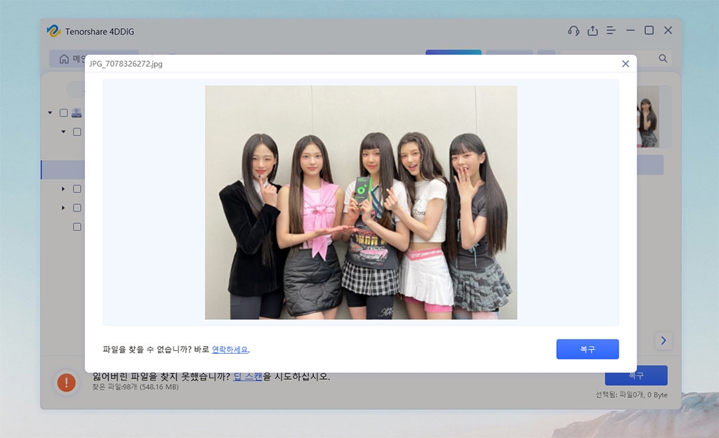 미리보기 해보니 깔끔하니 복구할 파일을 알 수 있죠? 뉴진스 배경화면 사진을 찾았네요.